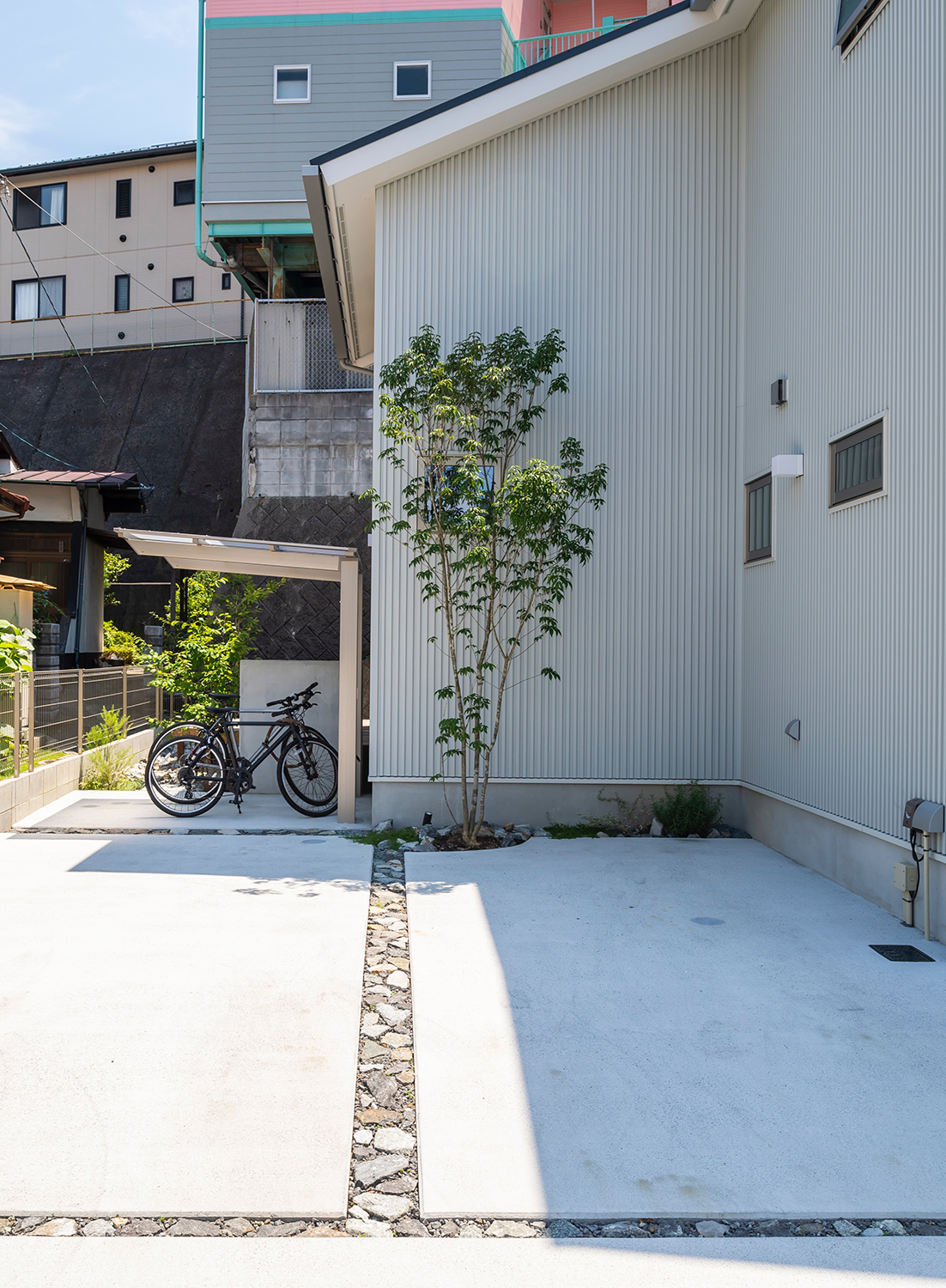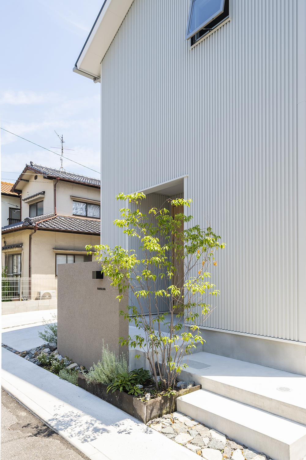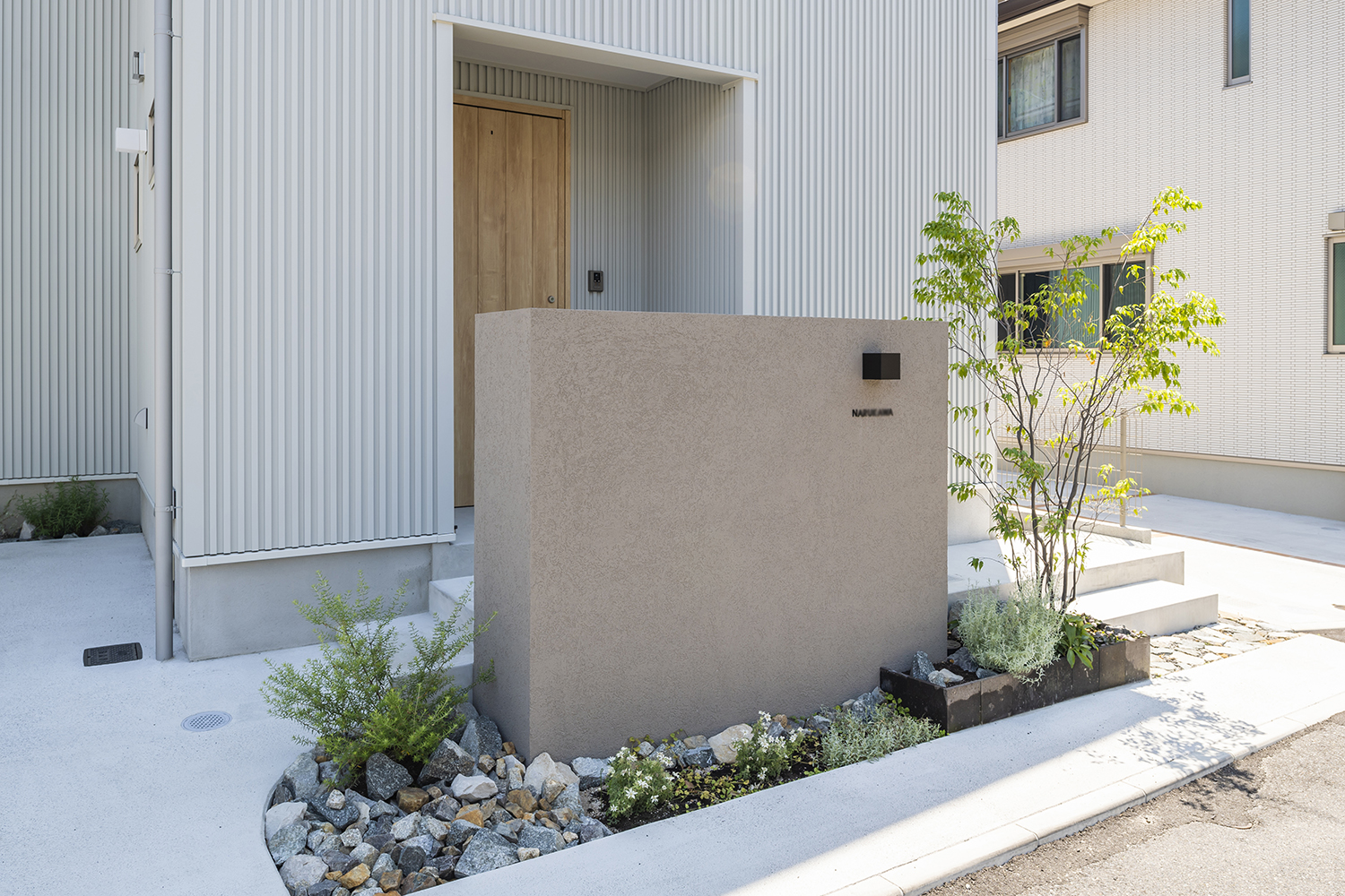 住まいと調和する外まわりの空間を目指し、コンクリートやモルタル、自然石など素材を絞りシンプルにまとめることで、植栽の緑が引き立つやさしいファサードとなった。