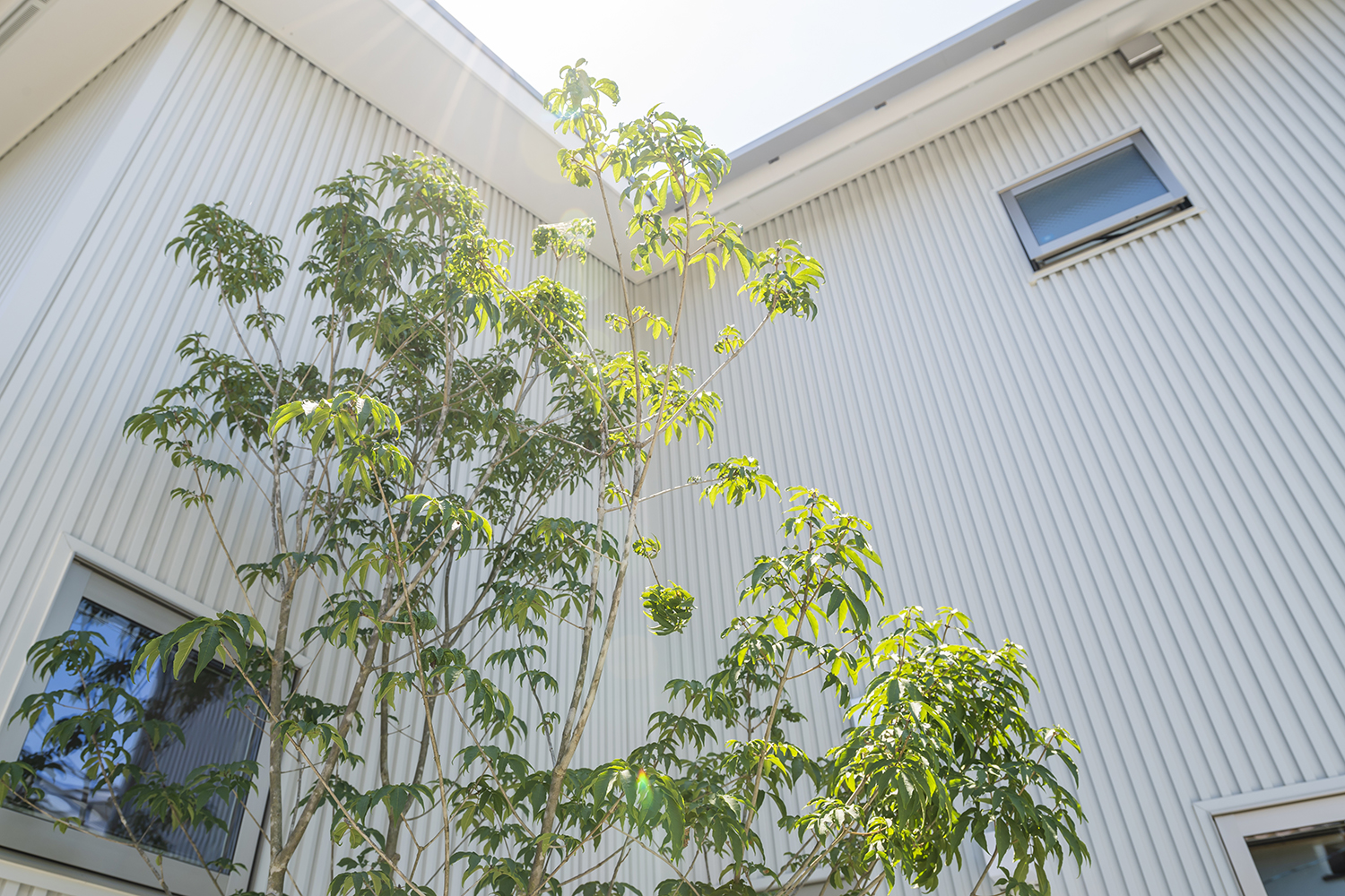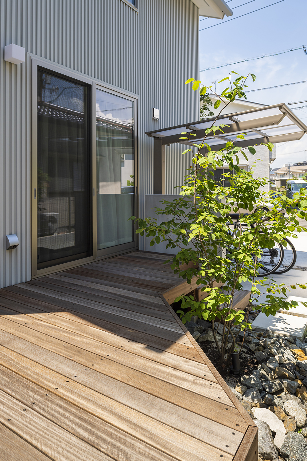 日頃のお手入れを考えて植栽は多くはないが、殺風景にならないよう緑が引き立つ場所にポイントとして緑を配し、背の高いアオダモが窓からも望むことができるよう提案した。リビングとつながるウッドデッキは、駐輪スペースの奥に目隠し壁を設け、よりプライバシーを確保した。リビングの前はウッドデッキの出幅を短くすることで縁側のような空間をつくり、窓から見えるジューンベリーが季節を演出してくれる。