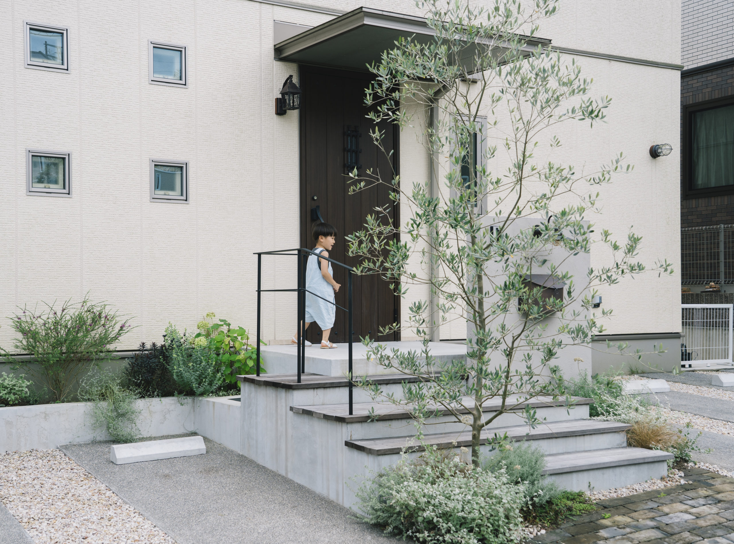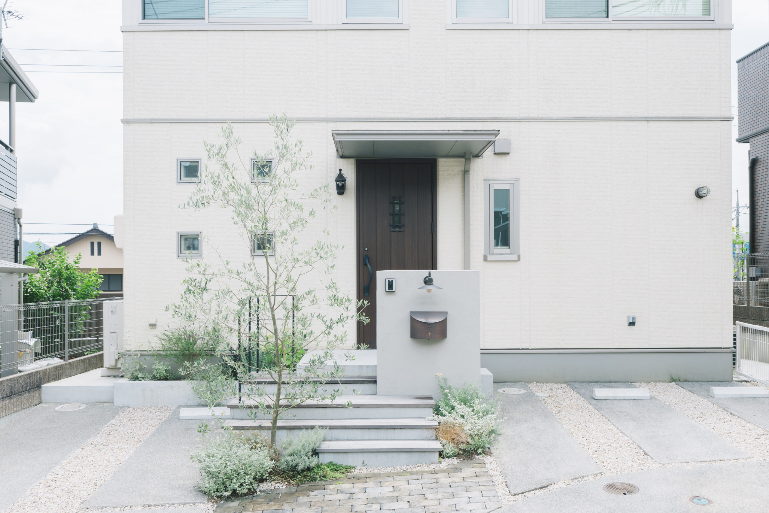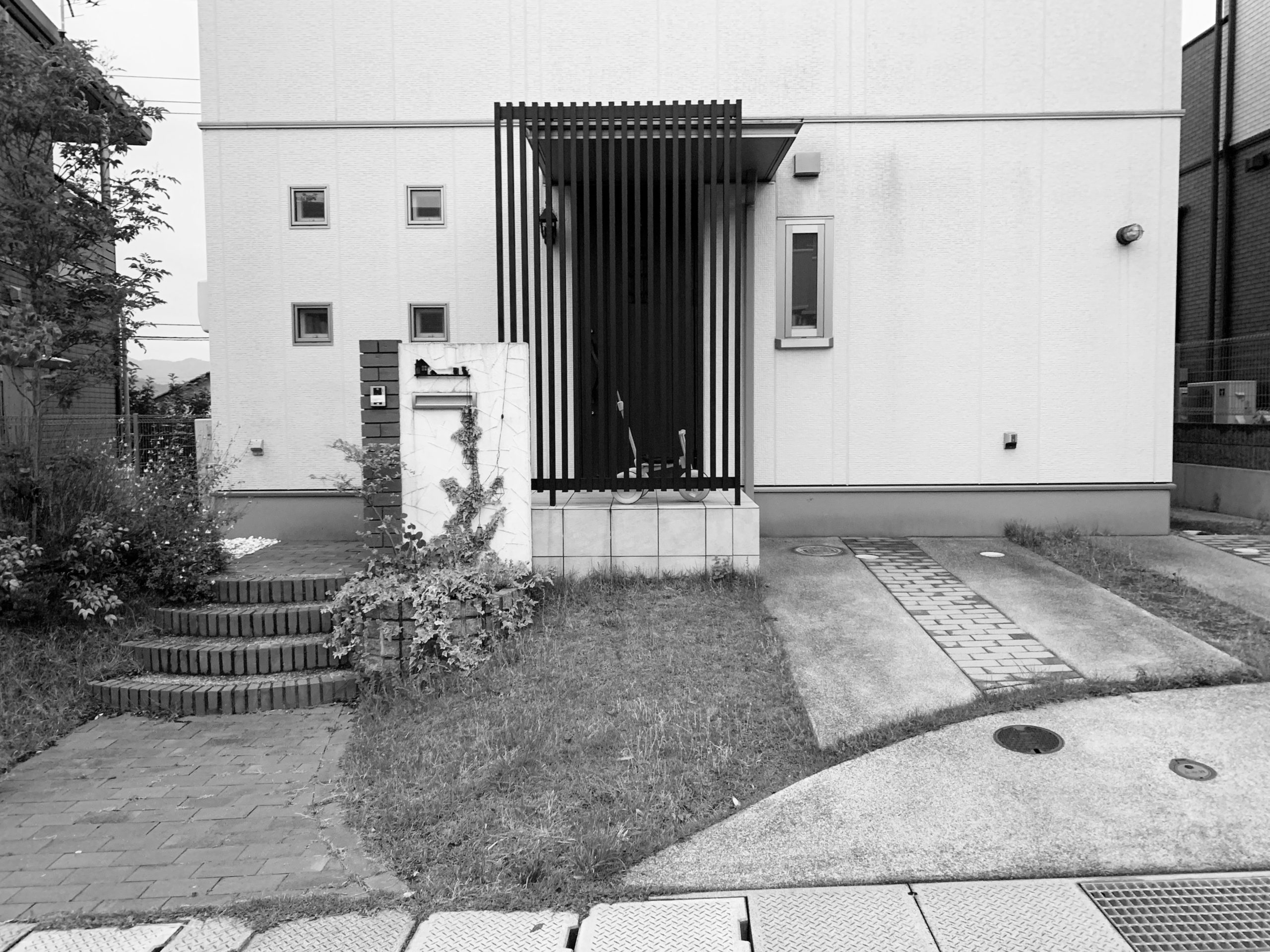 広島県東広島市にある住宅。新築から5年ほどのタイミングでエントランスやアプローチの大掛かりなリノベーションを行なった。新築と同時に施工されていた外構は、建物の打ち合わせが忙しい新築時には、十分に外構のデザインを考える時間もないままだったという。時間が経つにつれ、当時はきれいだった芝生や植物も年々手入れも難しくなったころ、毎日を過ごす住まいにも、もっとご自身のライフスタイルや好みを取り入れて暮らしを充実させたいと、暮らしを楽しまれ、住まいのデザインにも関心の高い施主様の想いが募り、ゾーニングや導線から大きく見直すこととし、大胆な外構リノベーションとなった。