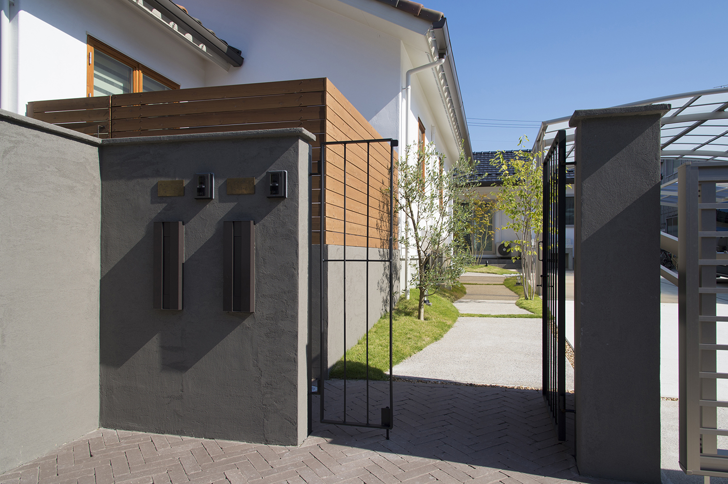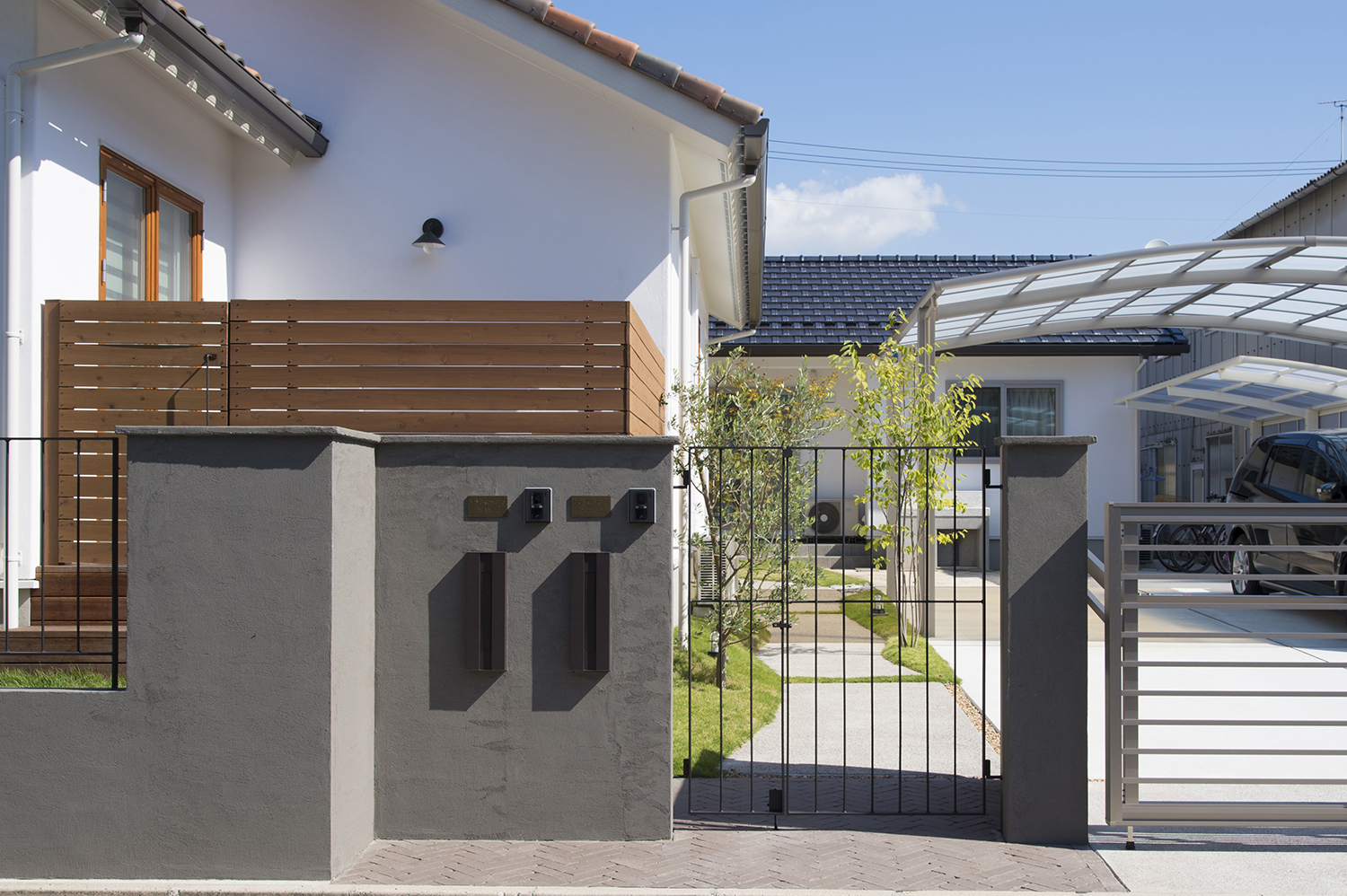 セキュリティー面に配慮した駐車スペースはゲートを設け、アプローチの入り口には高さのあるスチール門扉をデザインした。二世帯ということもあり、表札やポスト、インターホンがそれぞれ2つずつ設置する必要があるため、落ち着いた色味の壁面にも馴染む素材のものを選定している。敷地内にはフェンスに囲まれたリビングの延長のような閉ざされたデッキ空間もあり、日常使いの空間として重宝する場所。また、魚釣りが趣味のお父様には外で魚を捌くためのガーデンシンクを造作した。シンク上部は高さを出した縁取りとなって水が垂れないよう設計。2世帯ということもあり、庭という場所で様々な過ごし方を楽しんでいただいている。