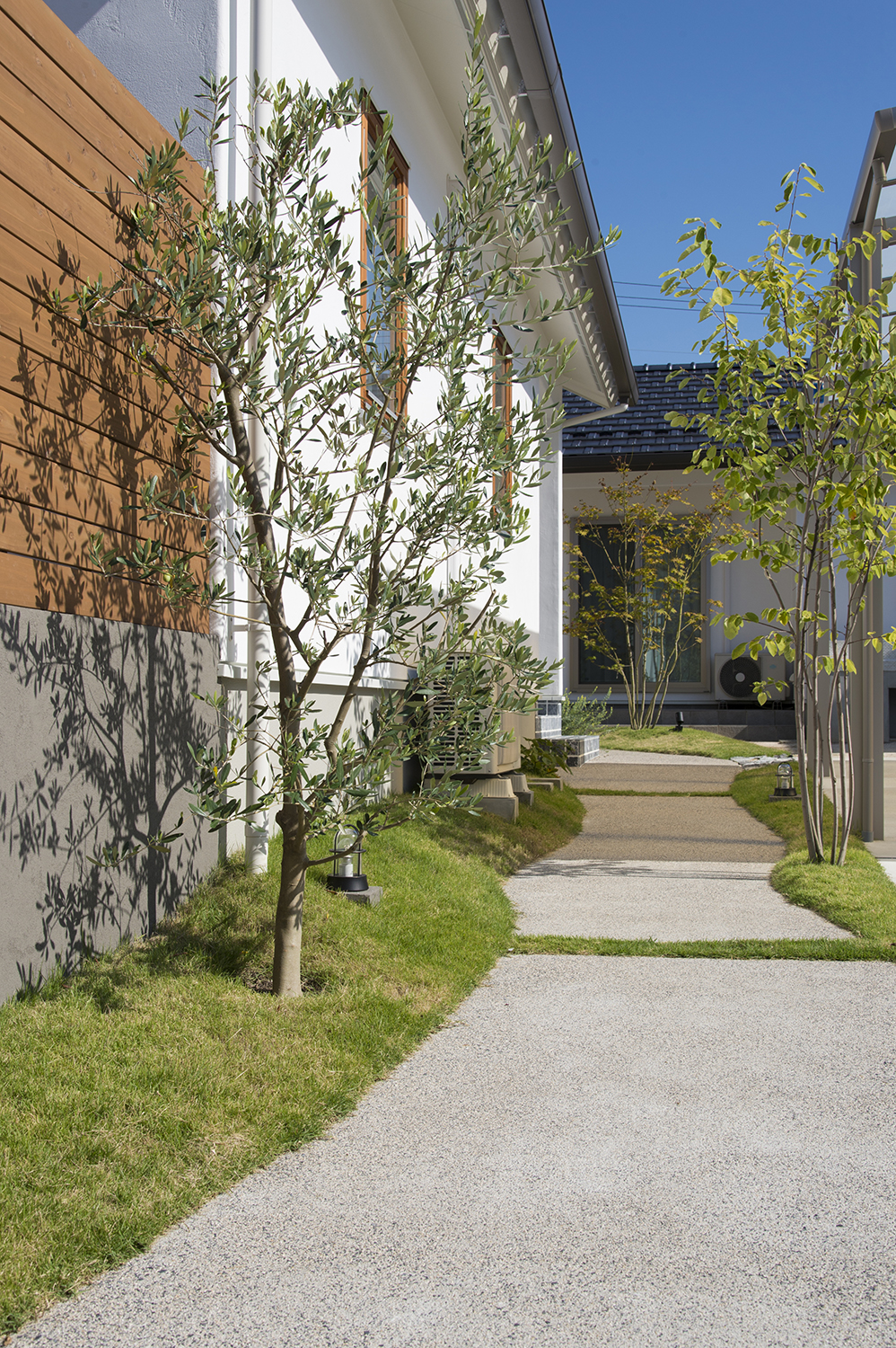 建て替えにより広い敷地の中に2棟の建物が新築され、駐車スペースと玄関まで続くアプローチは併設したゾーニングとなったが、植物がお好きな施主様のために、幅の不規則な小道をつくり両サイドに生まれる空間にランダムに植栽することで、視覚的にも駐車スペースと空間を分けることにもつながり、自然の中を歩いているかのような楽しいアプローチとなった。