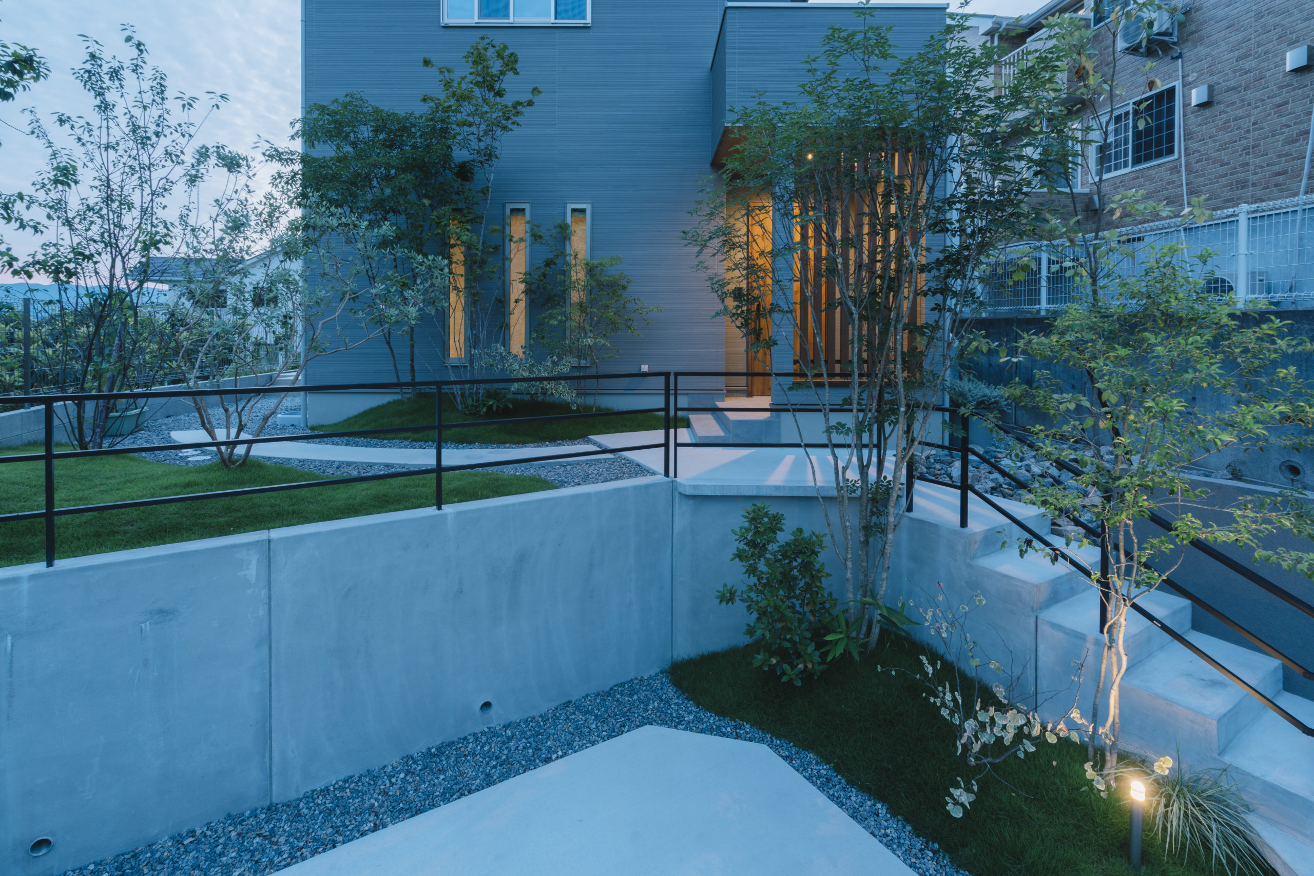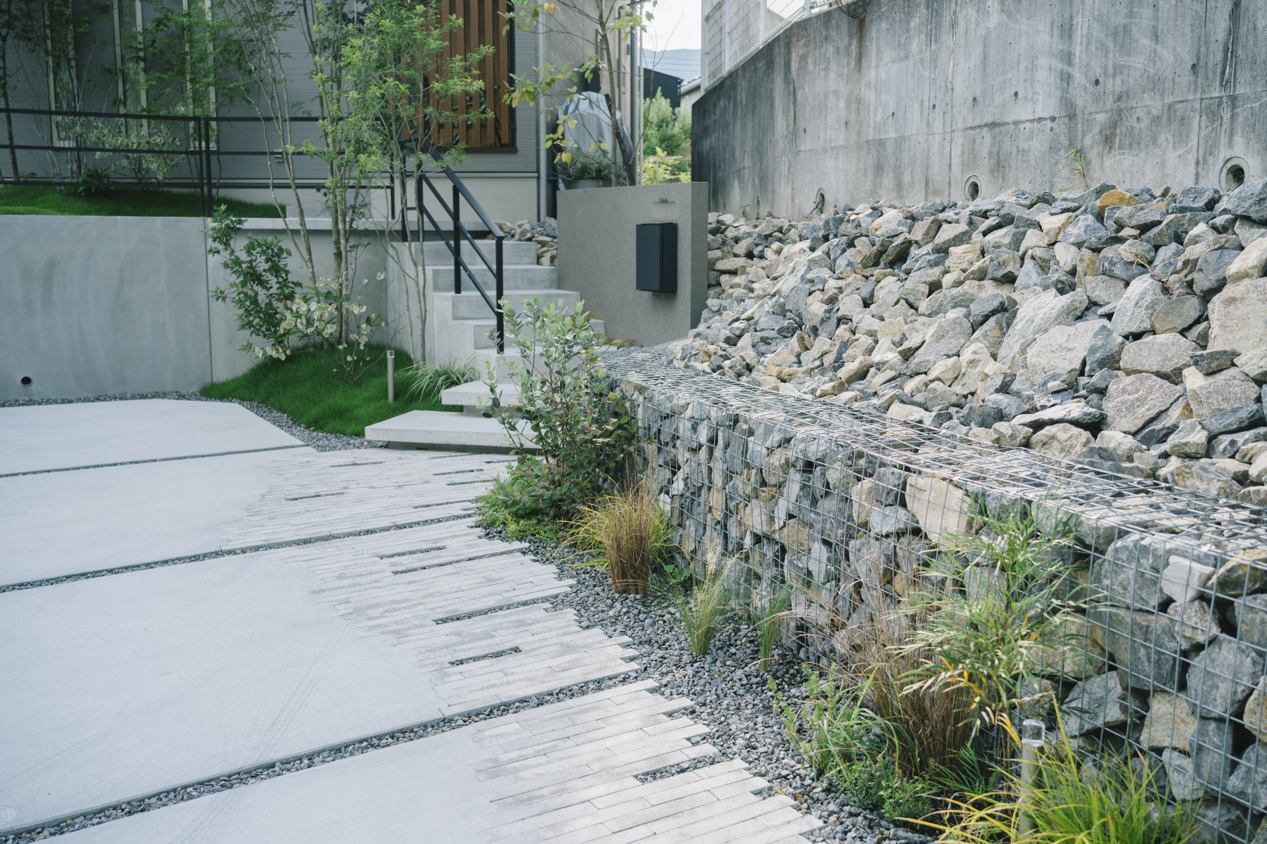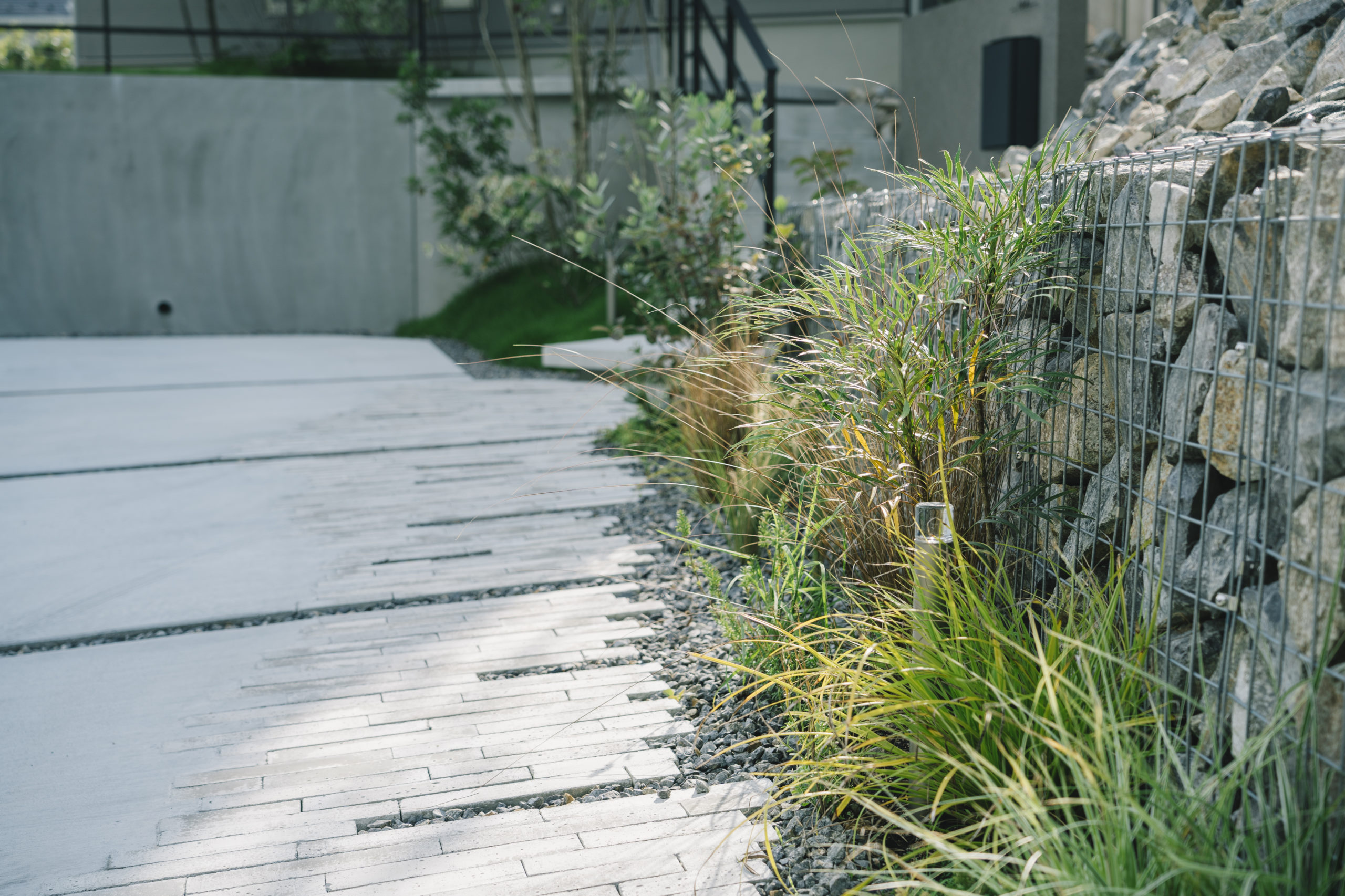 アプローチは、直線的な動線ではなく自然なリズムを感じられ、足元には視覚的な変化を持たせながらもシンプルな素材を採用したことで主張を抑えつつ、印象的なアプローチとなっている。また、オーナメンタルグラスや季節の移ろいを感じる植栽などの優しい緑は、アプローチ沿いに設けた蛇籠の壁面に沿うようにアクセントとなり、距離のあるアプローチに癒しや愉しみが感じられる場所となった。