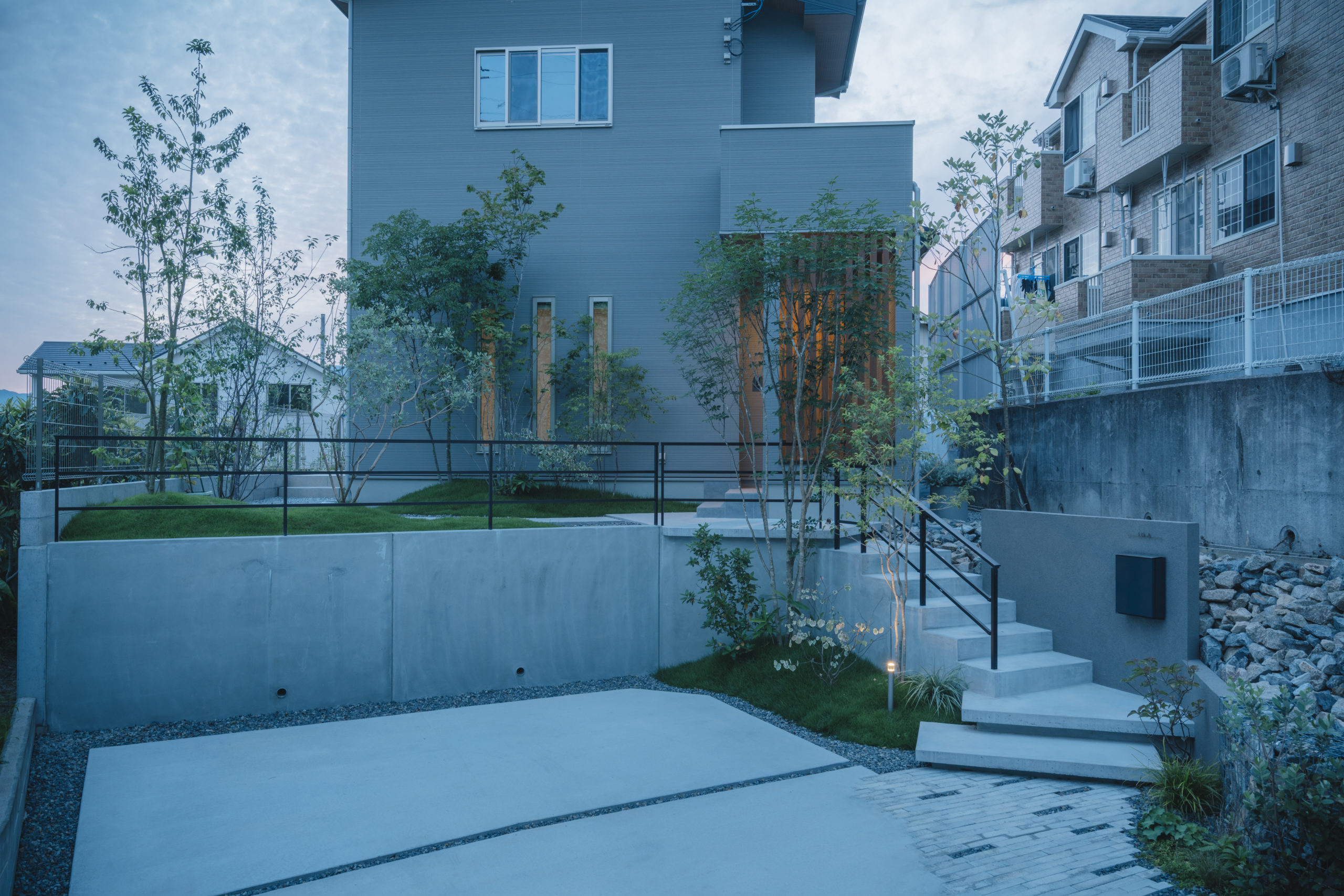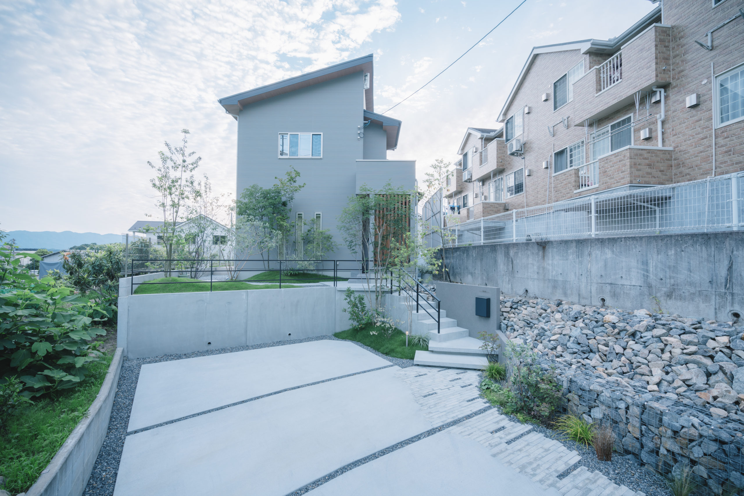 高低差のある敷地に建つ新築住宅の外構と造園の計画。一般的に道路から玄関までの距離が長いことはデザイン的にも単調になりがちであるが、駐車スペースの一部を法面の形状に寄り添う小道のようなアプローチとして素材に変化を持たせ、建物とも調和し、自然を感じる空間となった。また、有効活用が難しい法面は高低差を緩和し自然石で覆うことにより、崩壊の抑止だけでなくアプローチのデザインの一部として、周囲の景観に馴染む風景となっている。