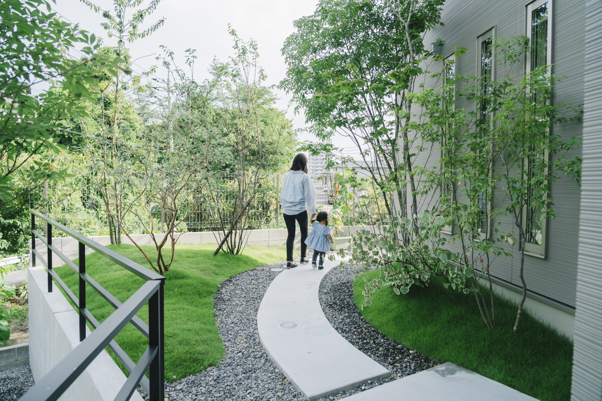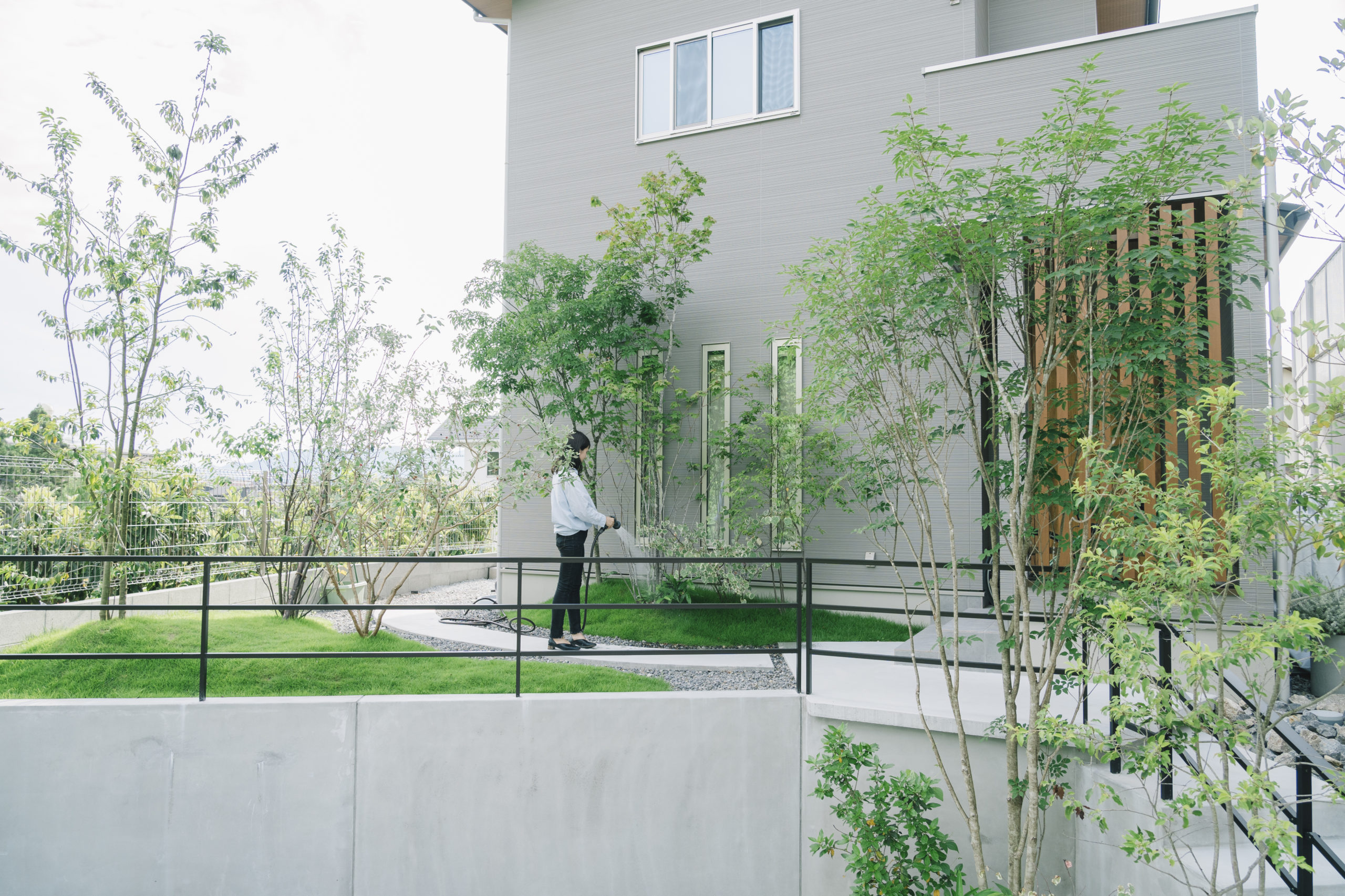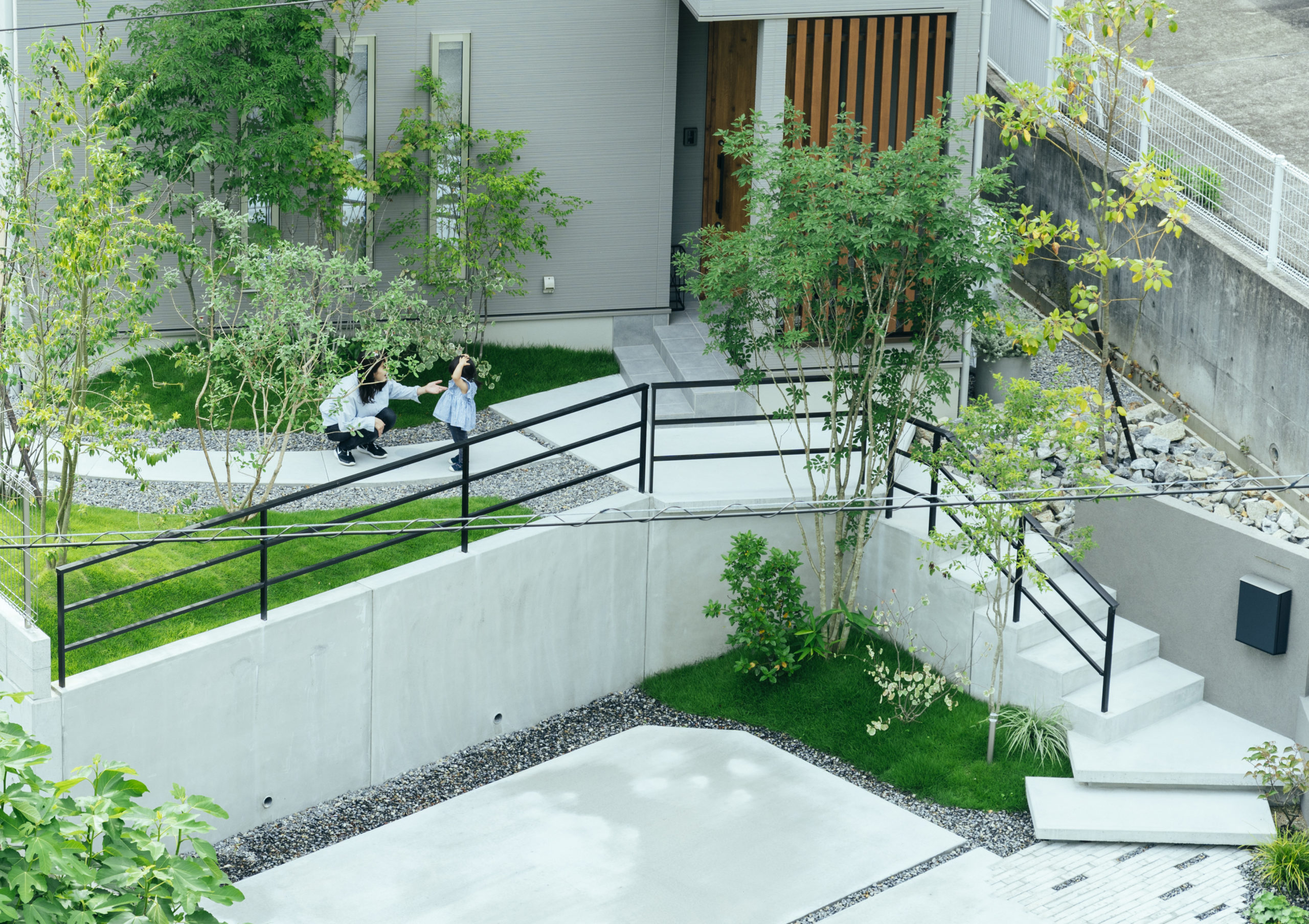 高低差があり、構造物の多い外構は時に冷たい印象を与えがちだが、階段を上がっていくと、訪れる人を迎えてくれる緑いっぱいの庭は、公園に足を踏み入れたような心地よさと、公園の小径を歩くような開放感を生み、住まいへと続く時間を心地よいものへと変えていく。ただの移動のための道ではなく、暮らしの中でふと立ち止まりたくなるような、風景の一部としてのアプローチ。歩みを進めるごとに、少しずつ変わる景色の連なりが、この家の表情を豊かにしている。