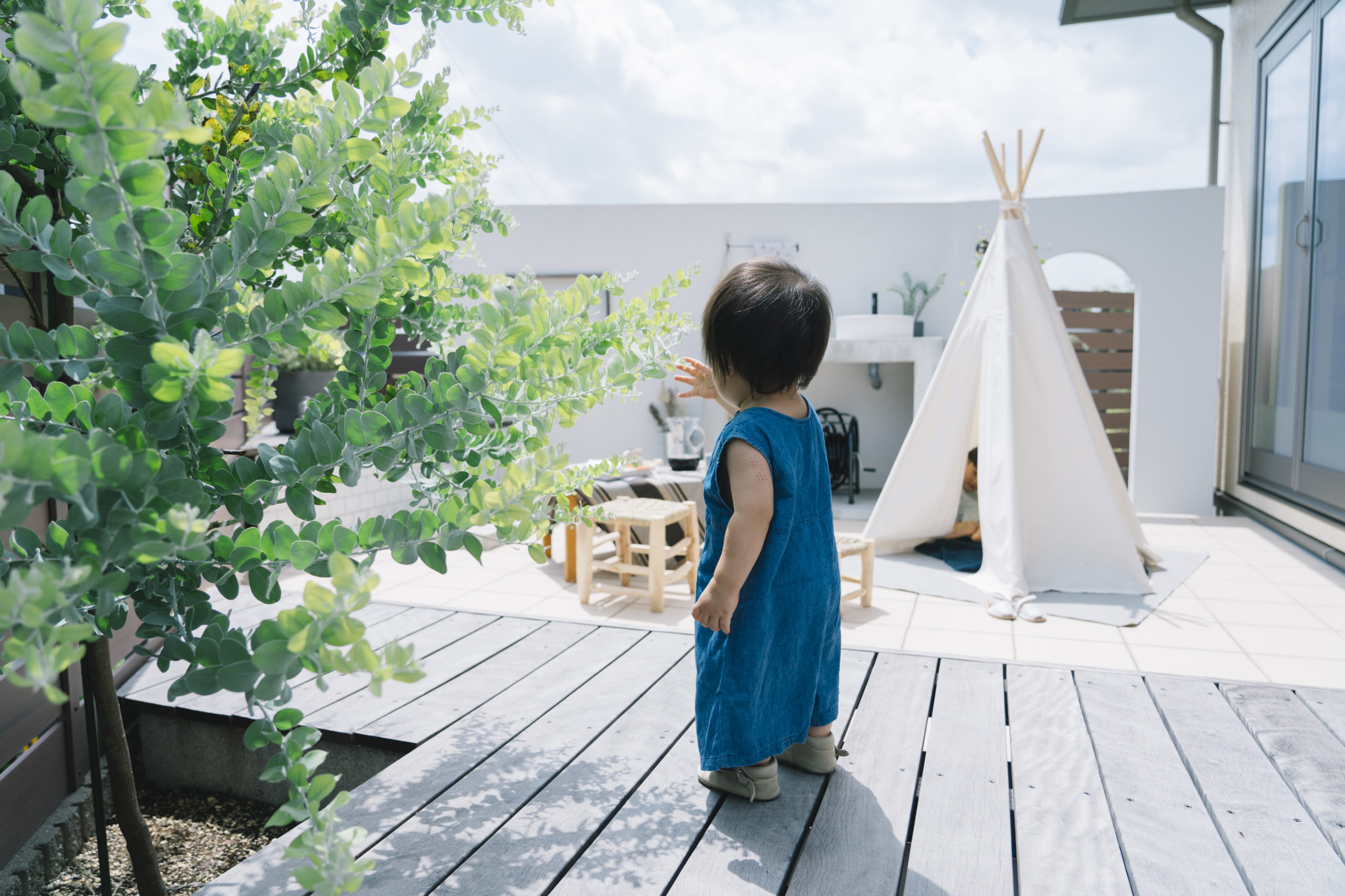 リノベーションで目指したのは、室内とゆるやかにつながり、家族が思い思いに過ごせる第二のリビングのような庭。シンプルでありながら、施主の暮らしやライフスタイルにとけこみ、時間を経ても飽きのこない空間である。室内からフラットにつながる、新たに設置したウッドデッキは、暮らしの延長として内と外をゆるやかにつなぎ、パールアカシアの優しい緑が視線をやさしく受け止め、庭に落ち着きと彩りを与えている。そこから一段下がったタイルデッキは、庭のスキップフロアのように広がり、ウッドデッキとの段差はベンチとしても機能する。座る場所を選びながら、それぞれの過ごし方に寄り添っている。またタイルデッキの一角にはガーデンシンクを設け、庭で簡単な食事の準備や片付けもできるようにした。その背後に立つ大きな白い塗り壁は、庭のアクセントであり、目隠しとしても心強い存在。切り取られたアーチの開口部からは、日常の中にわずかな非日常の気配が漂う。変形地を活かしてつくられた三角形のウッドベンチは腰掛けにもなり、小さなデッキとして子どもたちの遊び場としても活躍する。この第二のリビングのような空間は庭としてただ眺めるものではなく、季節を問わず、家族が集い、遊び、語らう。そんな風景が日々の暮らしの中にとけこんでいく、日々に寄り添う身近な場所として、家族とともに大切な時間を刻み、思い出を育むことのできる「過ごす場」となっている。