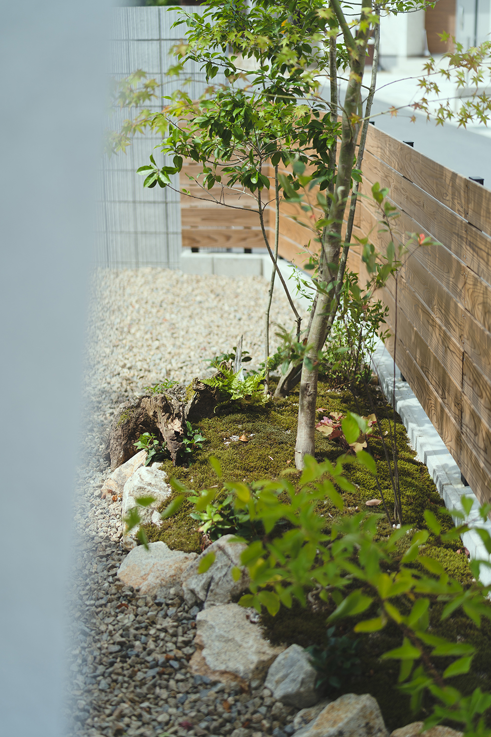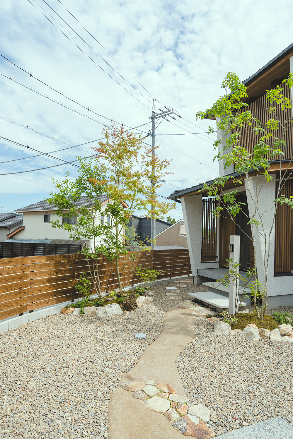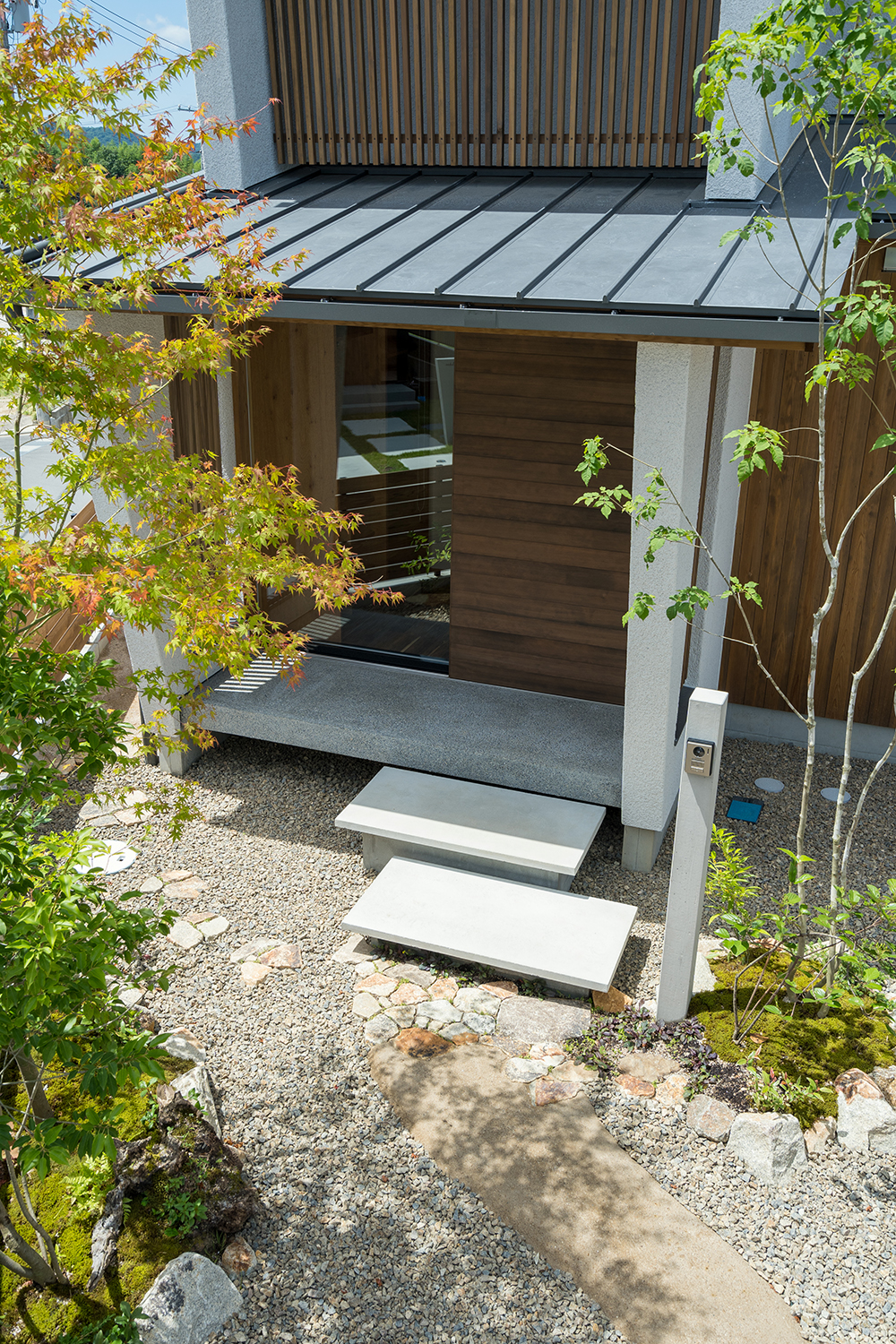 建築のデザインとの調和を図り、構造物はできるだけ控え目に、植栽や景色に馴染む自然素材などを組み合わせることで、シンプルで和みのある空間となっている。植栽が主役となった庭は、木漏れ日揺れる木々が日々の暮らしに癒しを与えてくれている。
