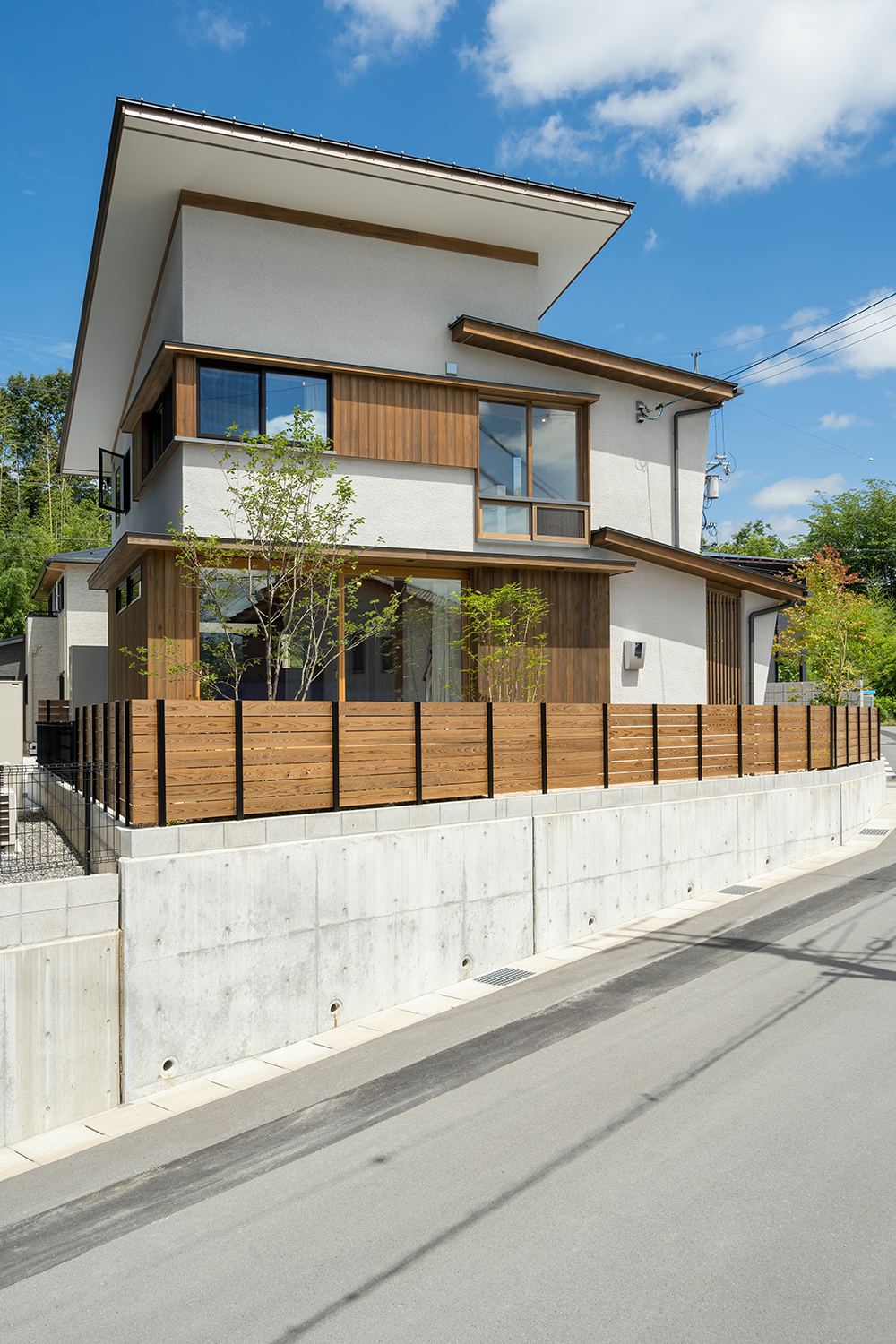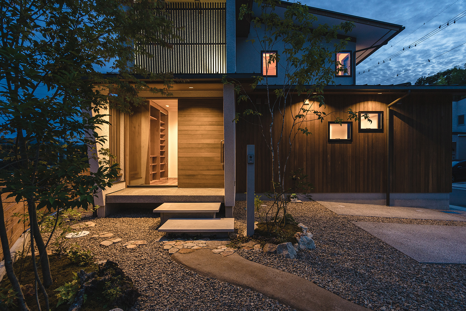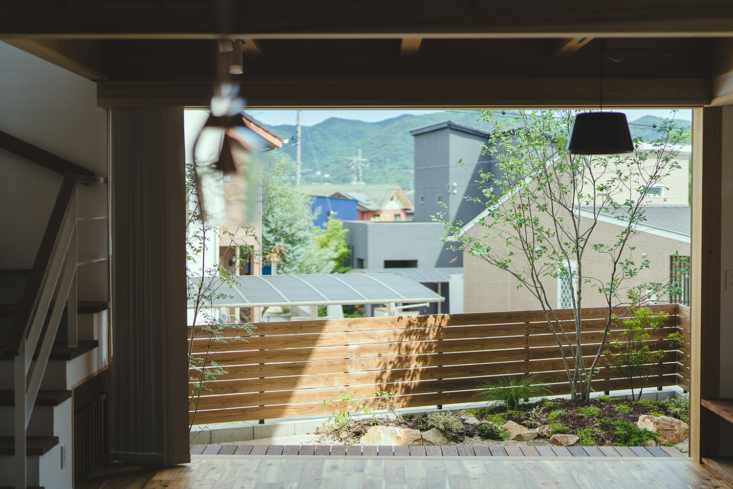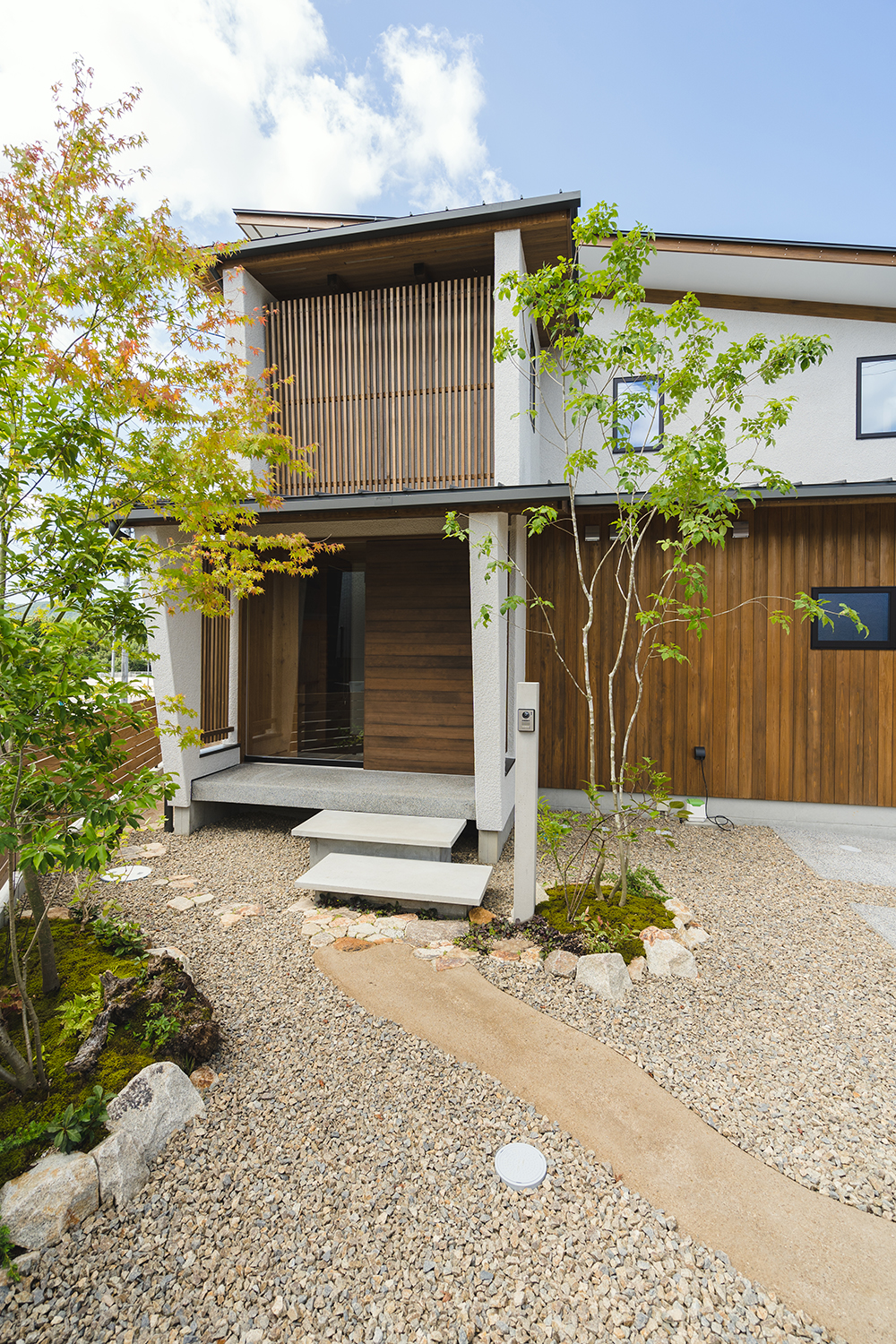 建築のデザインとの調和を図り、構造物はできるだけ控え目に、植栽や景色に馴染む自然素材などを組み合わせることで、シンプルで和みのある空間となっている。植栽が主役となった庭は、木漏れ日揺れる木々が日々の暮らしに癒しを与えてくれている。