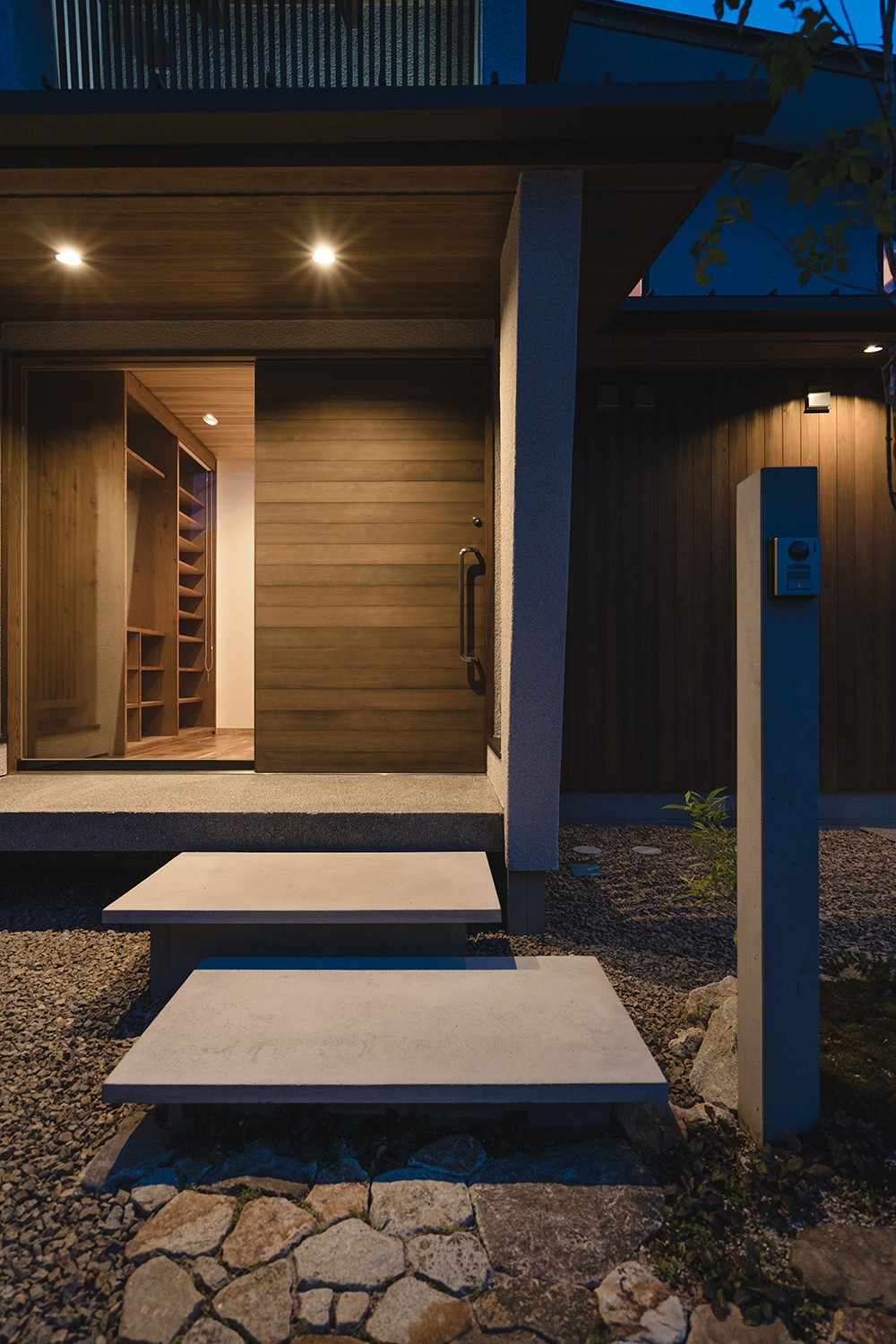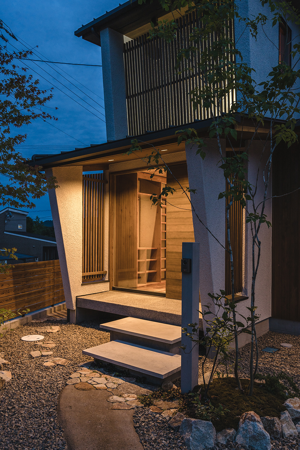門柱やエントランスはコンクリート素材とし、ステップは浮遊感のあるデザインでポーチとの関係性を意識して統一感を出した。要となる植栽は外部のバランスだけでなく、内外からの視線を意識した配置としているため、開口部から季節の移ろいも感じながら、目隠しとしての機能も担っている。