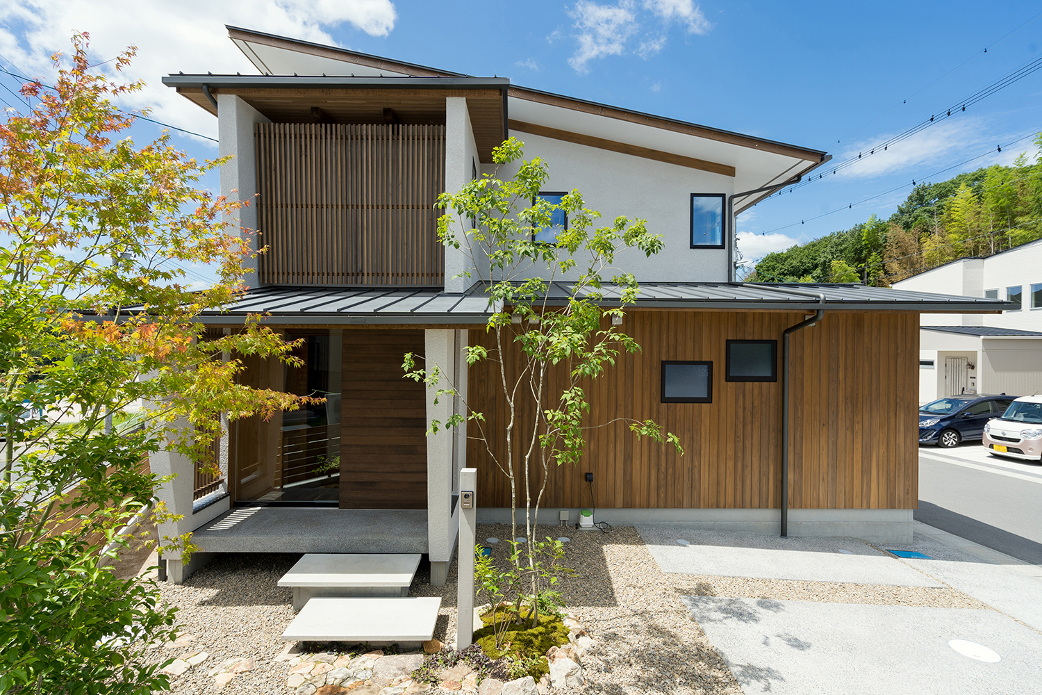 建築のデザインとの調和を図り、構造物はできるだけ控え目に、植栽や景色に馴染む自然素材などを組み合わせることで、シンプルで和みのある空間となっている。植栽が主役となった庭は、木漏れ日揺れる木々が日々の暮らしに癒しを与えてくれている。