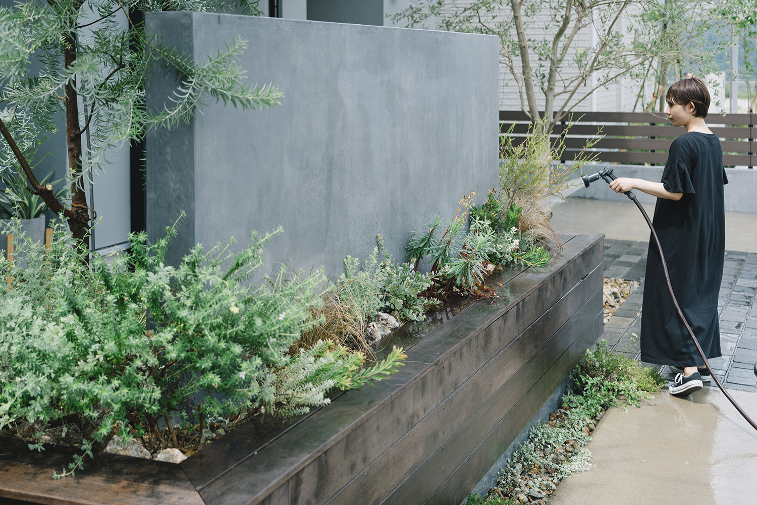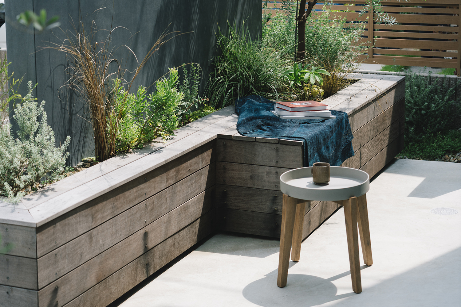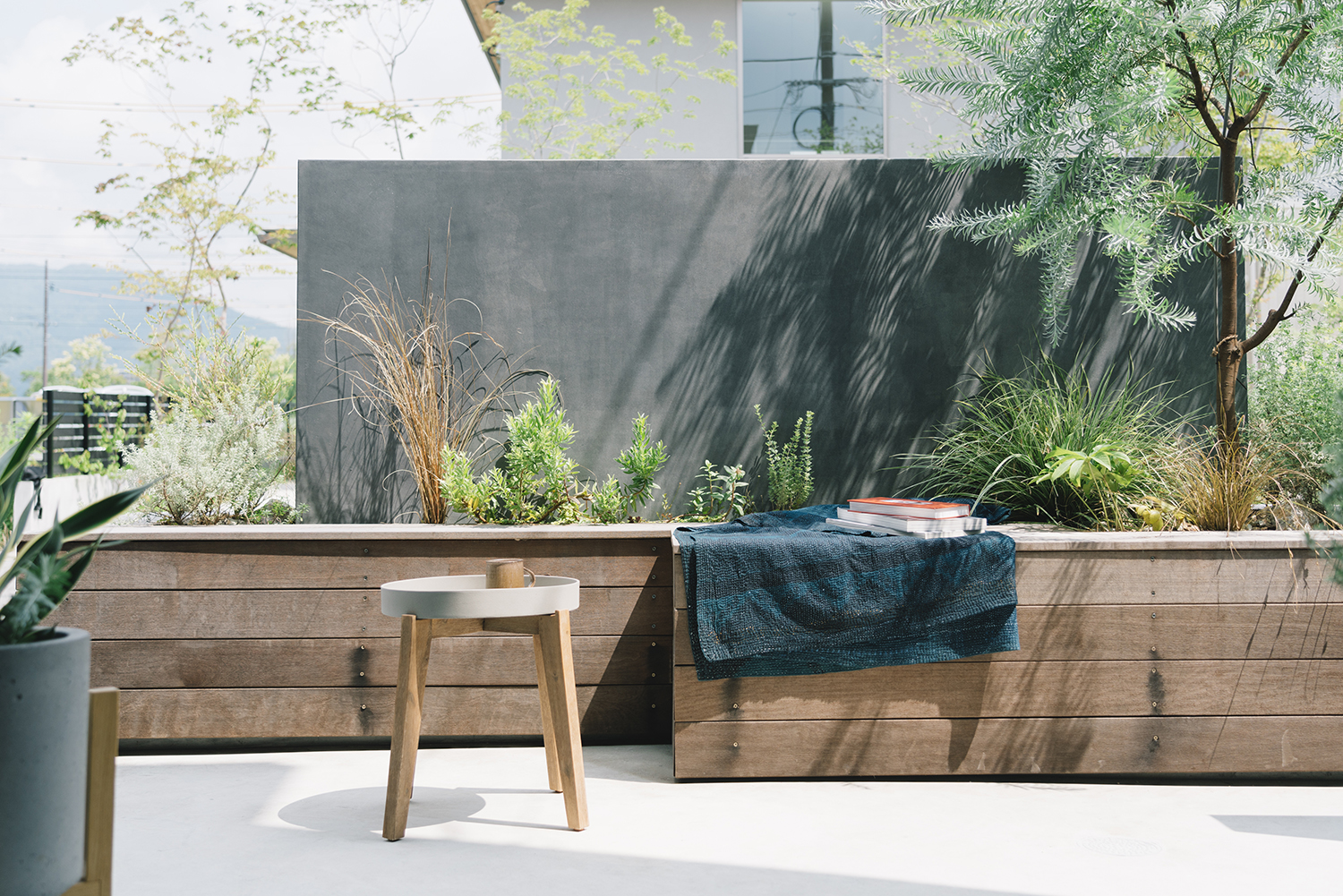 プライバシーを考えて造作した目隠し壁は、建物とのバランスを考えた高さ設定にすることで主張せず建物と一体となった。壁のまわりには庭で過ごすときに利用できるベンチをつくり、リビングとの対話空間が生まれるよう工夫。壁とベンチの隙間に植えたグリーンは、内と外の両面から眺められアクセントとなっている。植物の選定についても建築の雰囲気に合わせて全体をコーディネートした。