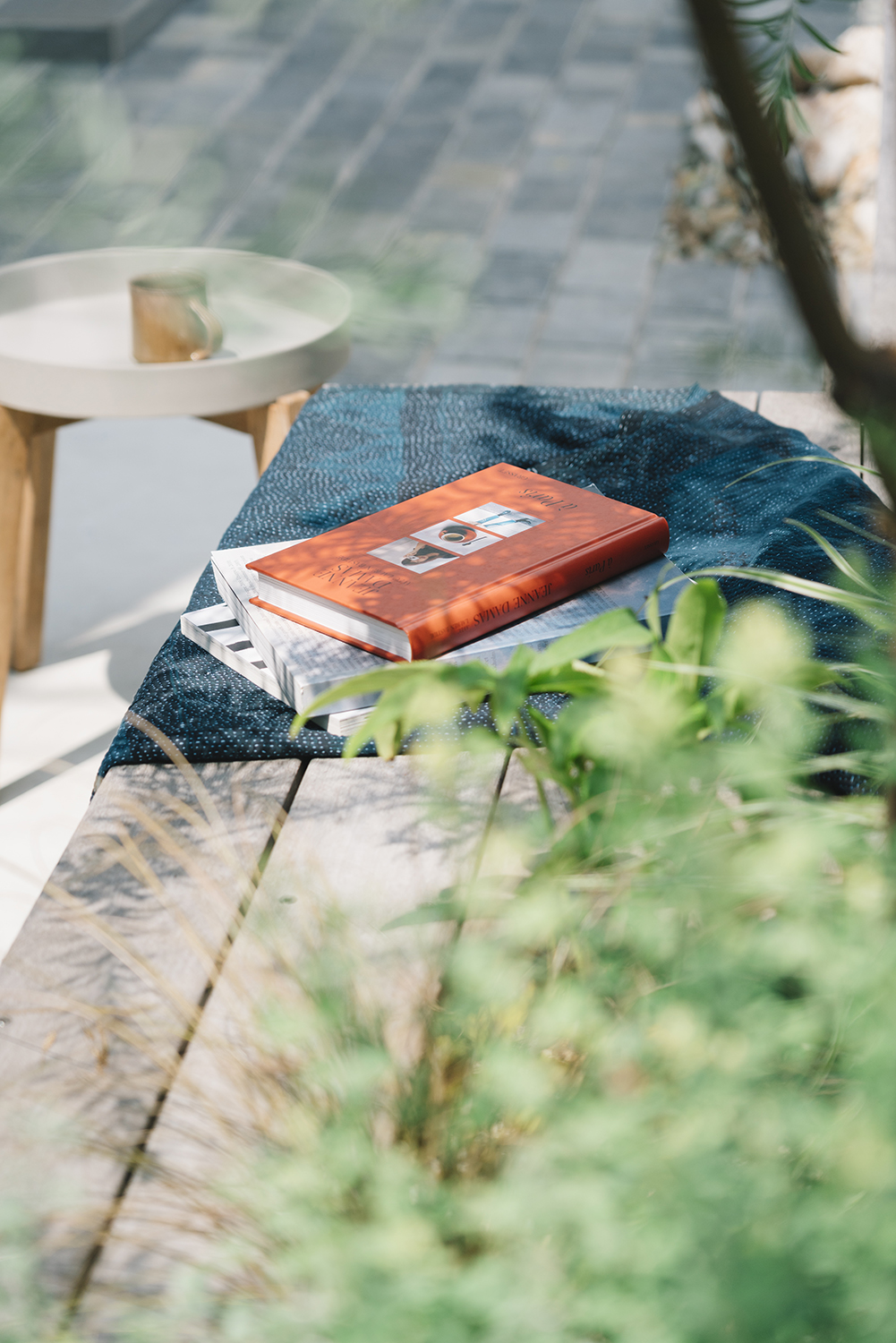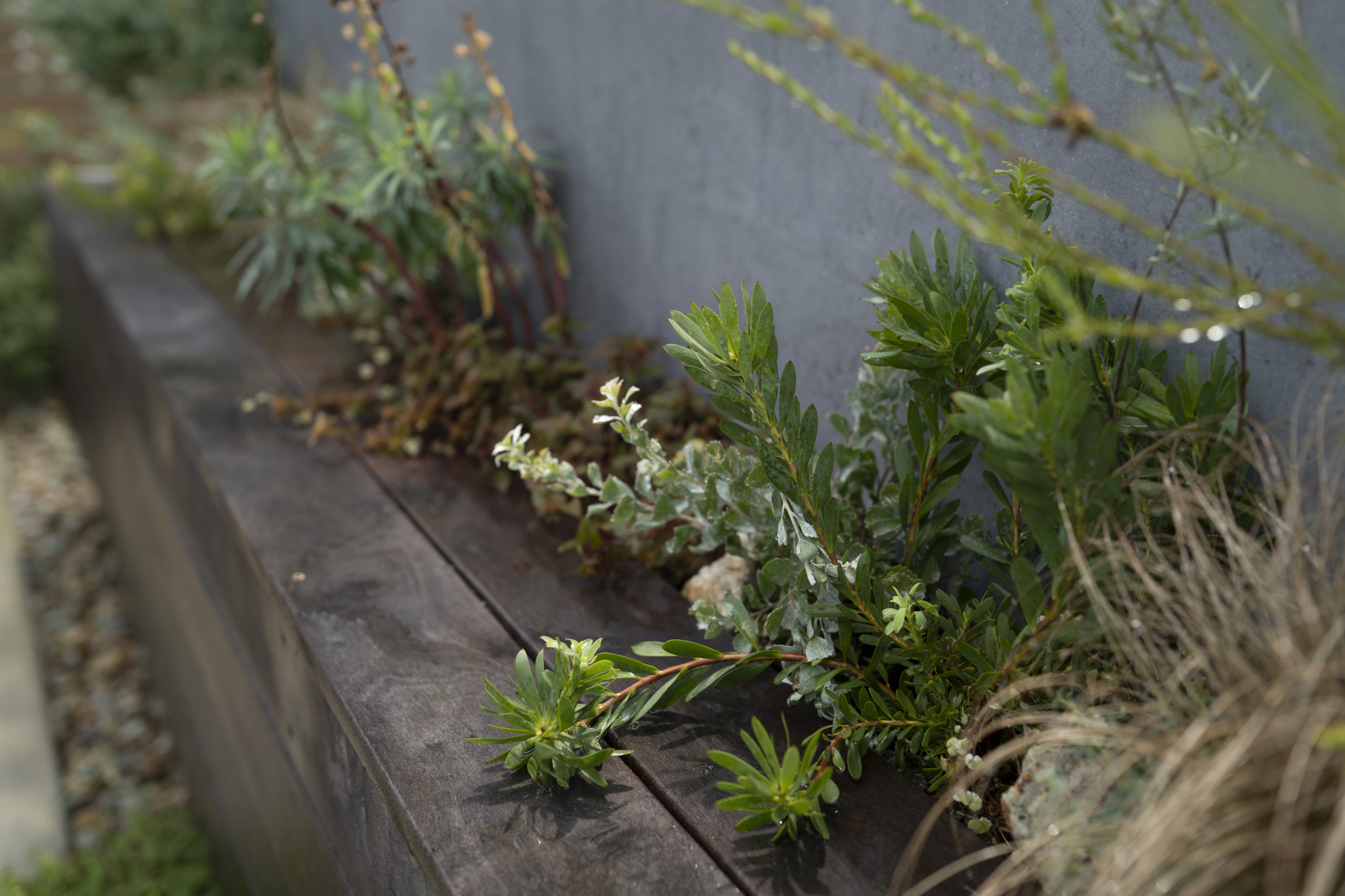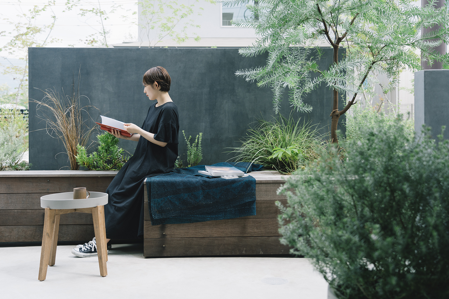 プライバシーを考えて造作した目隠し壁は、建物とのバランスを考えた高さ設定にすることで主張せず建物と一体となった。壁のまわりには庭で過ごすときに利用できるベンチをつくり、リビングとの対話空間が生まれるよう工夫。壁とベンチの隙間に植えたグリーンは、内と外の両面から眺められアクセントとなっている。植物の選定についても建築の雰囲気に合わせて全体をコーディネートした。