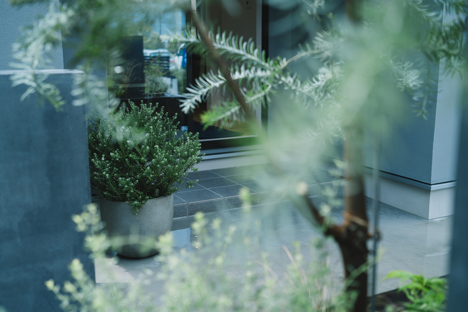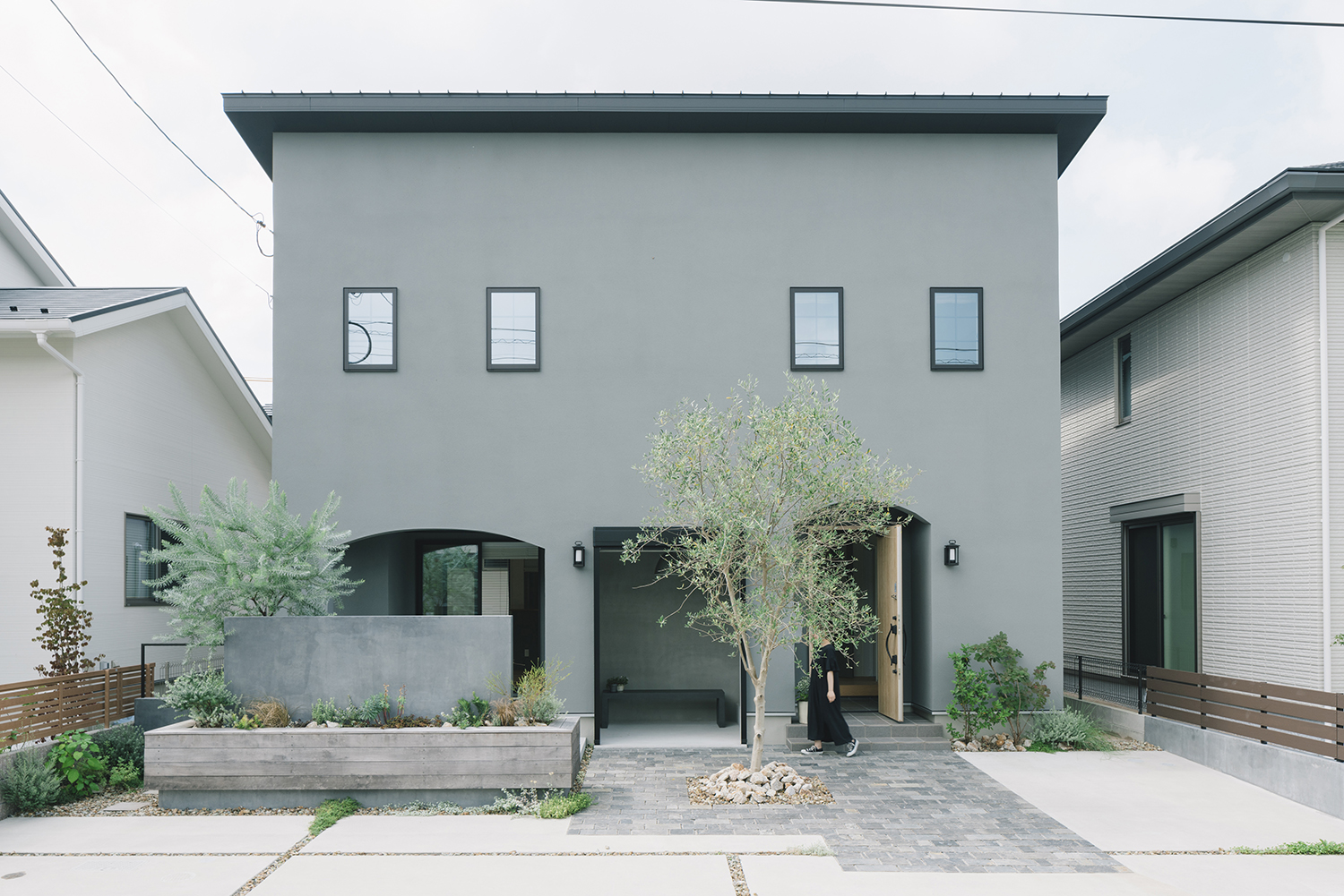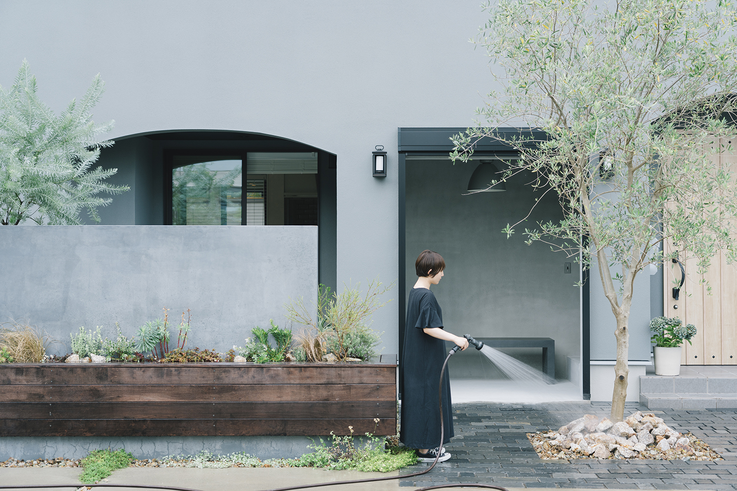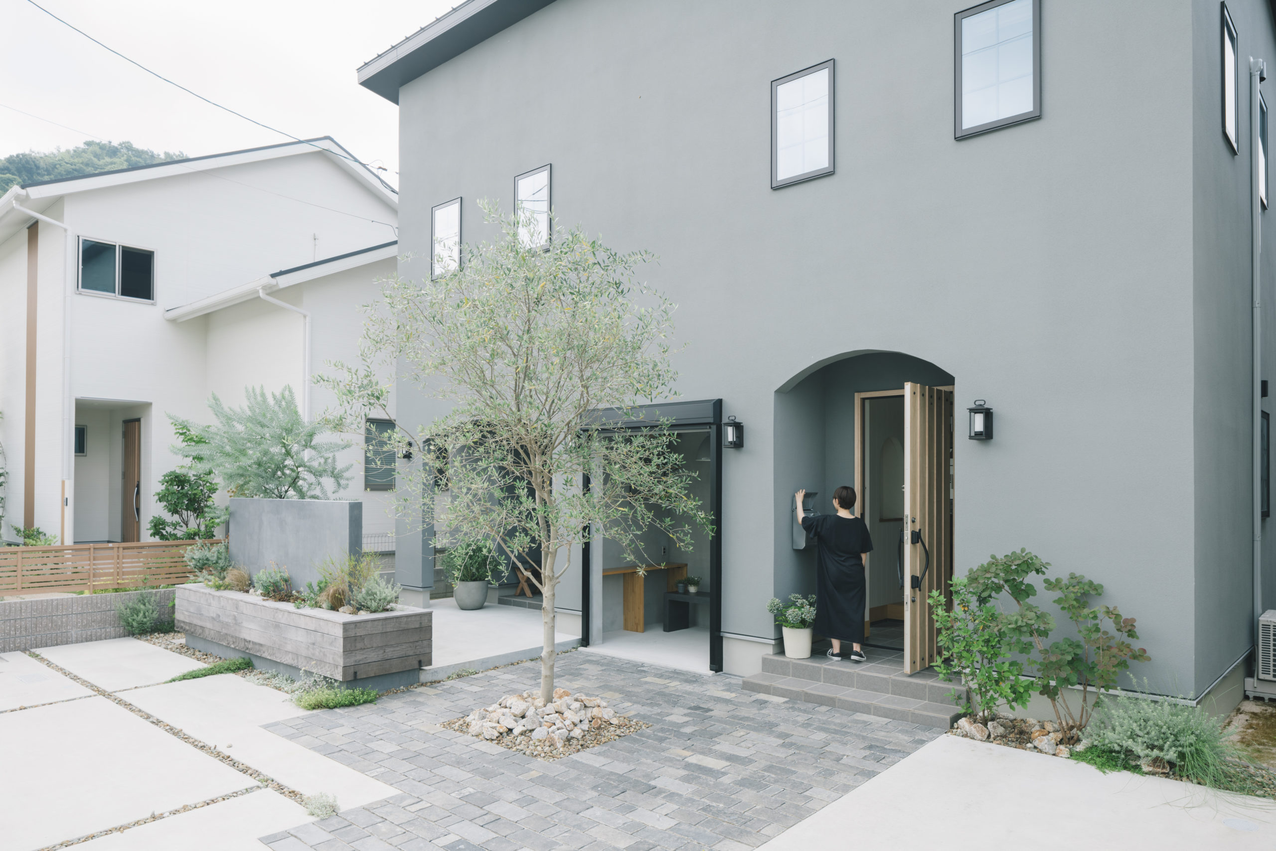 アプローチは表情のある石畳にすることで建物のデザインとの調和を図った。石畳は目地を深く取ることで影が生まれ、より存在感のある空間となった。このアプローチ空間の中心にはシンボリックなオリーブを植栽し、庭の一部としても感じられるよう、テラス空間との繋がりをもたせている。