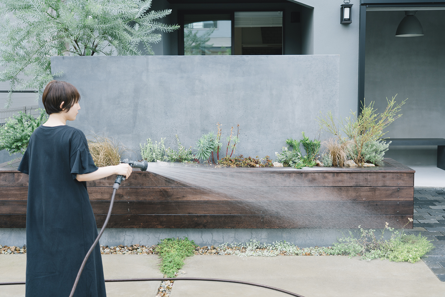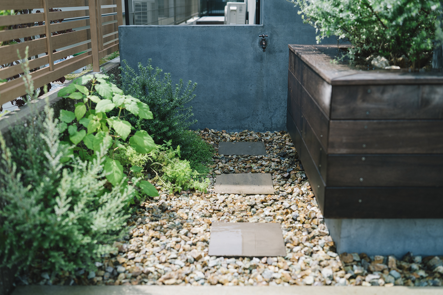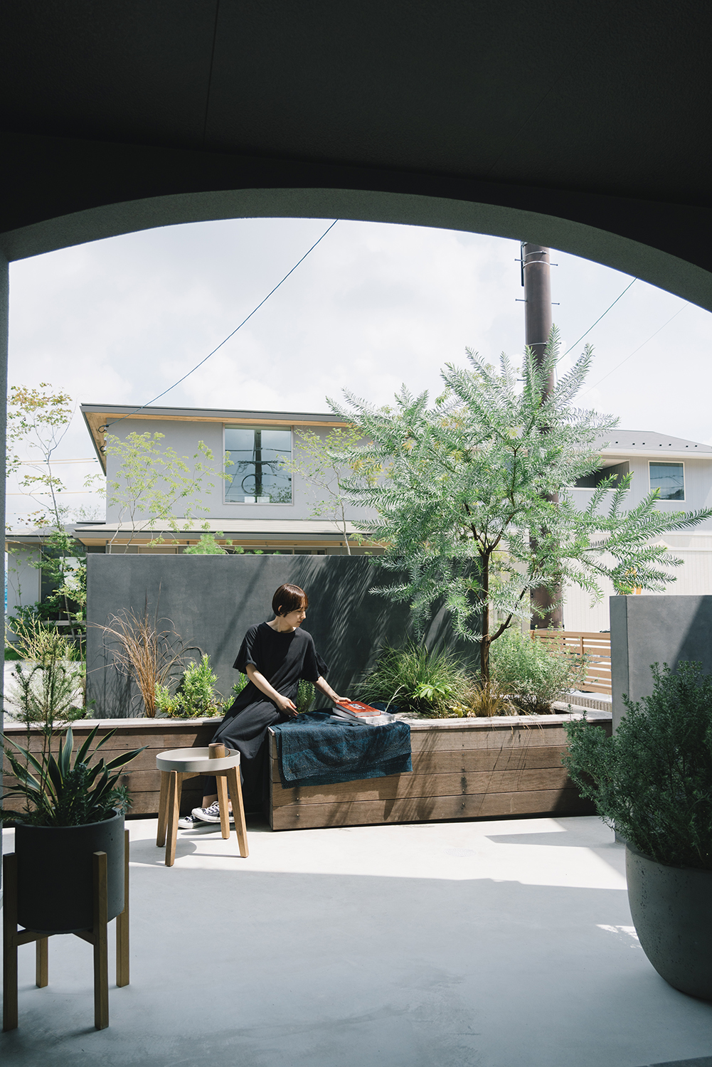 建物と外構の統一感のある素材を組み合わせ、また、テラスの空間においては塀によってプライバシーを守りつつ、表とのつながりを意識して計画した。座った目線の高さで花壇を作り、植物を見ながらくつろげるように室内からの目線を踏まえ設計。窓を開けても過ごしやすく、日々の暮らしで緑を感じてもらえる住まいになっている。