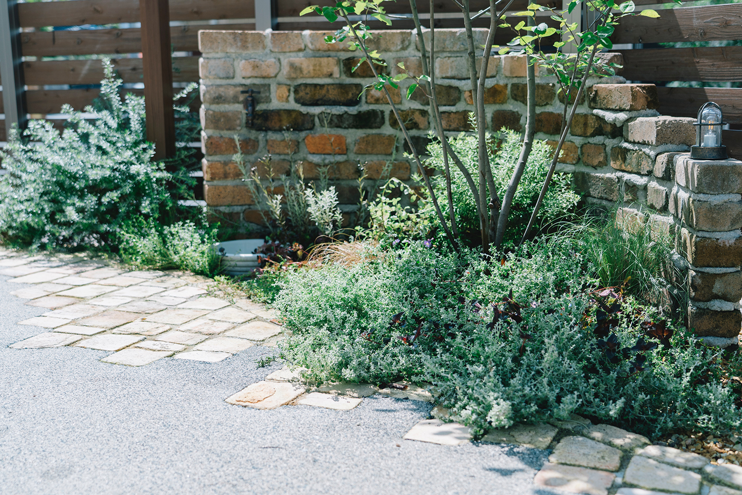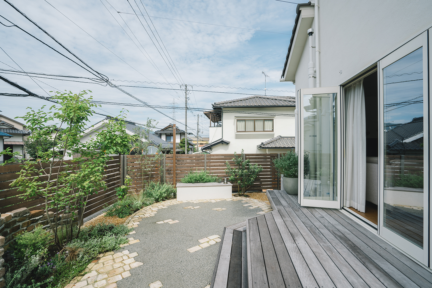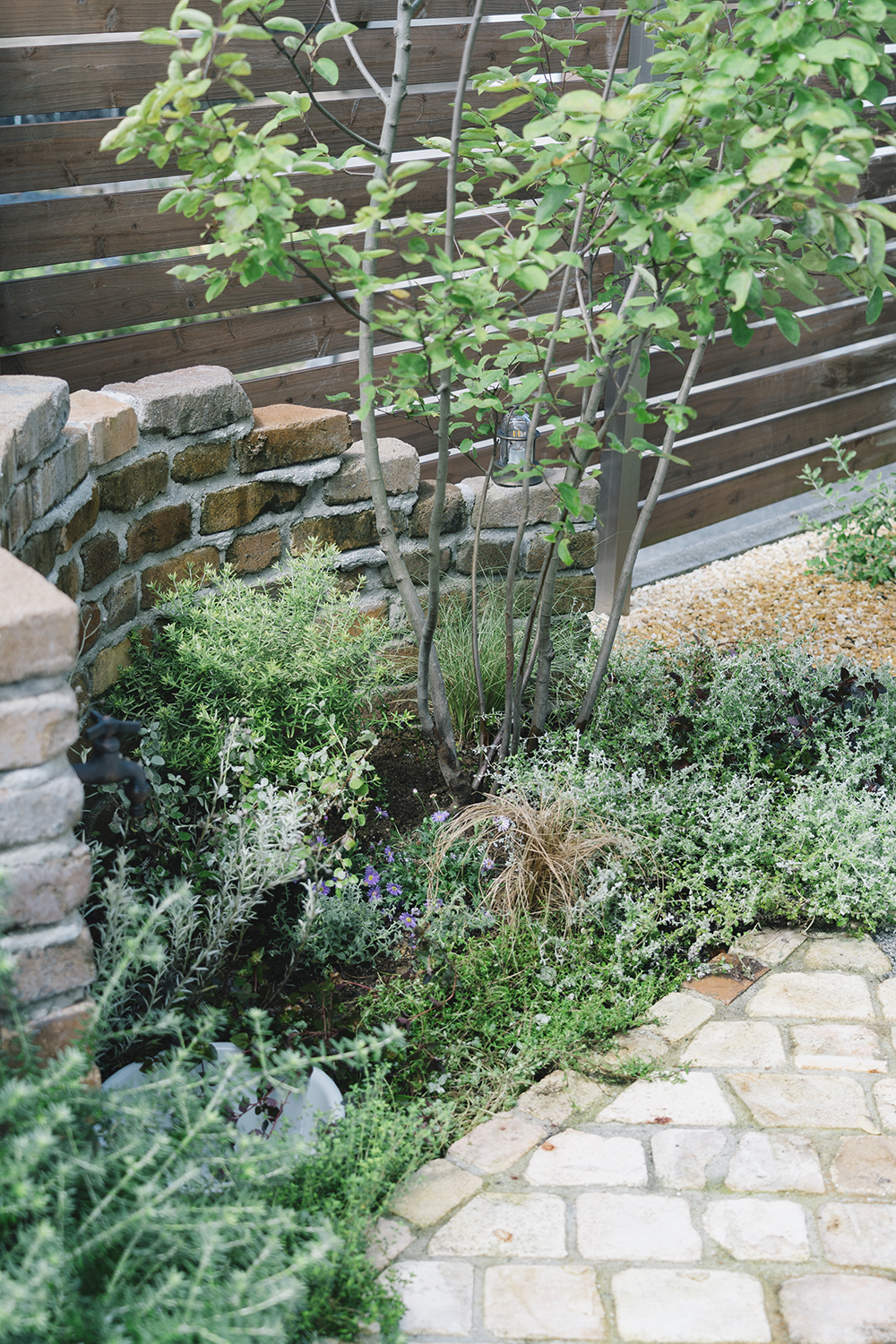 手付かずのまま新築から数年が経っていた庭。いつも出て過ごせる場所にしたいと話していたオーナー。開放感のあるフォールディング窓を開ければ、デッキは室内の延長として、庭という場所にシームレスにアクセスできる。デッキは出幅を変えることでデッキの上で食事を楽しんだり、テラスに降りれば広いスペースでベンチとデッキに腰掛けて会話を楽しんだり、バーベキューやお茶を楽しんだりできる。水場を兼ねた素材感のあるレンガ積みのウォールは庭のフォーカルポイントとして存在感をもち、様々な植物が季節を彩ってくれる。暮らしの中では様々なシーンがあるが、施主の好みや暮らし方に合わせながらも、自由に使えるよう空間を広く取ることで、それぞれのライフステージで楽しむことができる庭となっている。