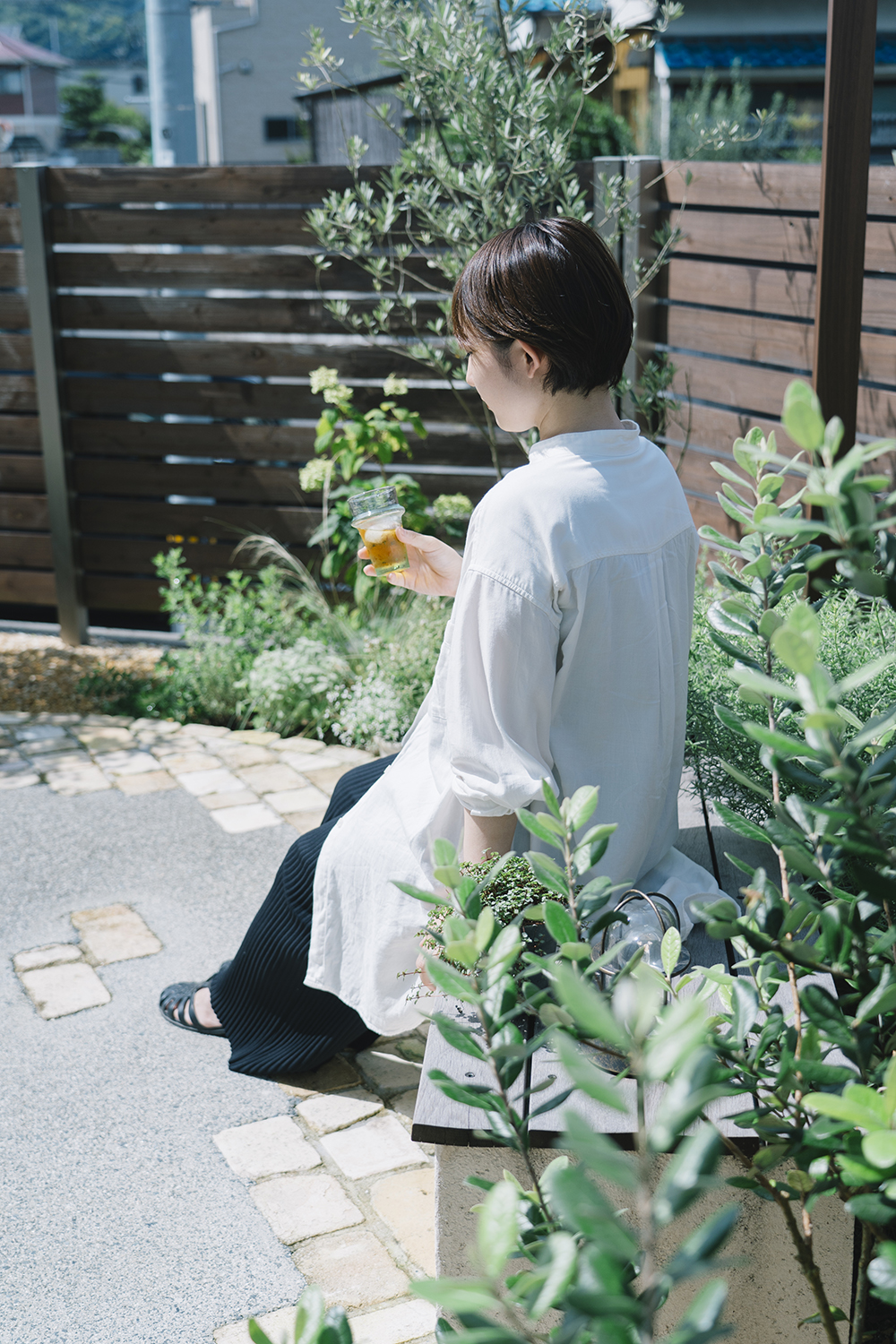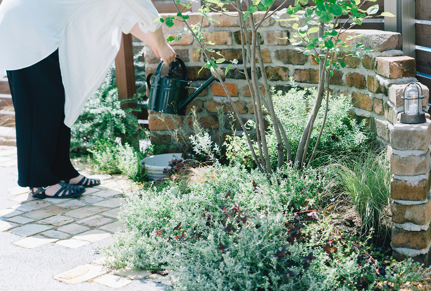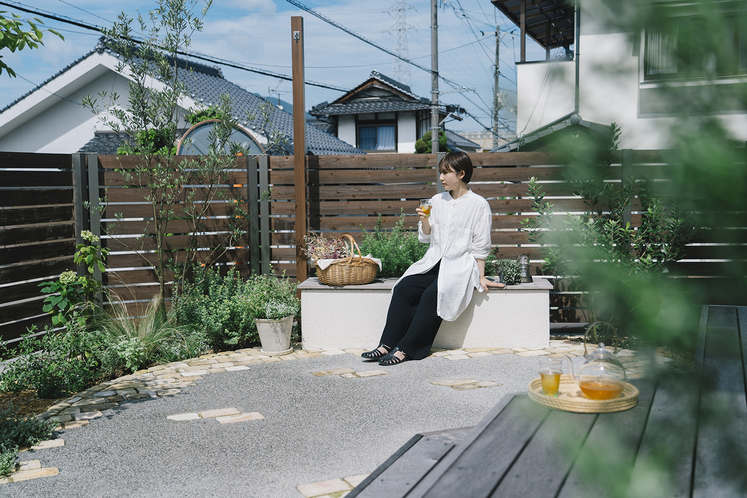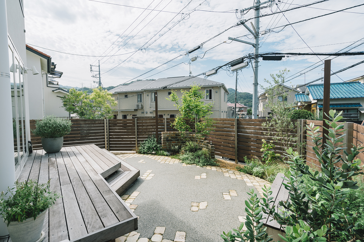 手付かずのまま新築から数年が経っていた庭。いつも出て過ごせる場所にしたいと話していたオーナー。開放感のあるフォールディング窓を開ければ、デッキは室内の延長として、庭という場所にシームレスにアクセスできる。デッキは出幅を変えることでデッキの上で食事を楽しんだり、テラスに降りれば広いスペースでベンチとデッキに腰掛けて会話を楽しんだり、バーベキューやお茶を楽しんだりできる。水場を兼ねた素材感のあるレンガ積みのウォールは庭のフォーカルポイントとして存在感をもち、様々な植物が季節を彩ってくれる。暮らしの中では様々なシーンがあるが、施主の好みや暮らし方に合わせながらも、自由に使えるよう空間を広く取ることで、それぞれのライフステージで楽しむことができる庭となっている。
